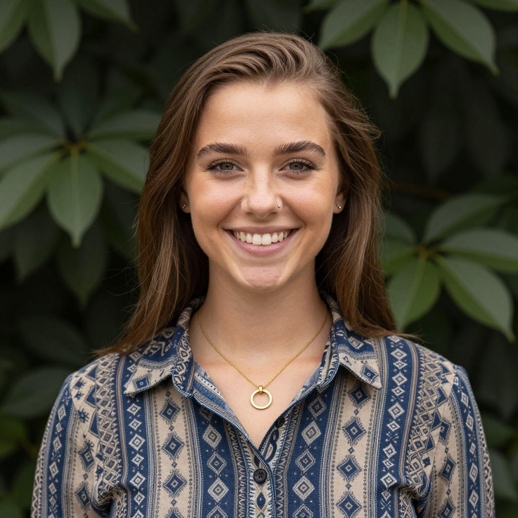 A smiling young woman with light brown hair in a blue, red, and white hockey jersey with "USA" on the chest. She holds a pair of red, white, and blue hockey gloves. Another woman with brown hair stands blurred in the background. They are indoors near an ice rink.