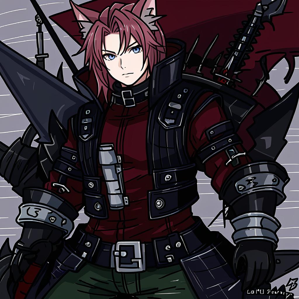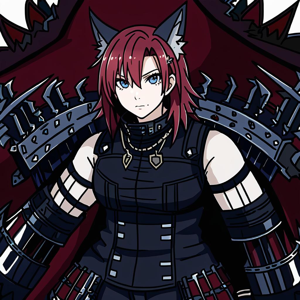 Digital anime-style illustration of a strong female character with red hair and blue eyes wearing dark, futuristic armor. The character has cat ears and a serious expression, detailed with spiked metallic shoulder armor and black tactical clothing, inspired by Cait Sith from Final Fantasy.