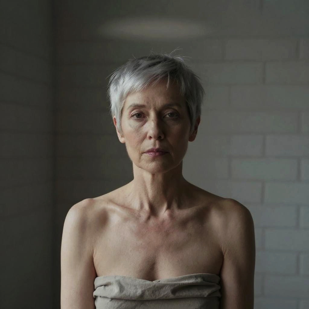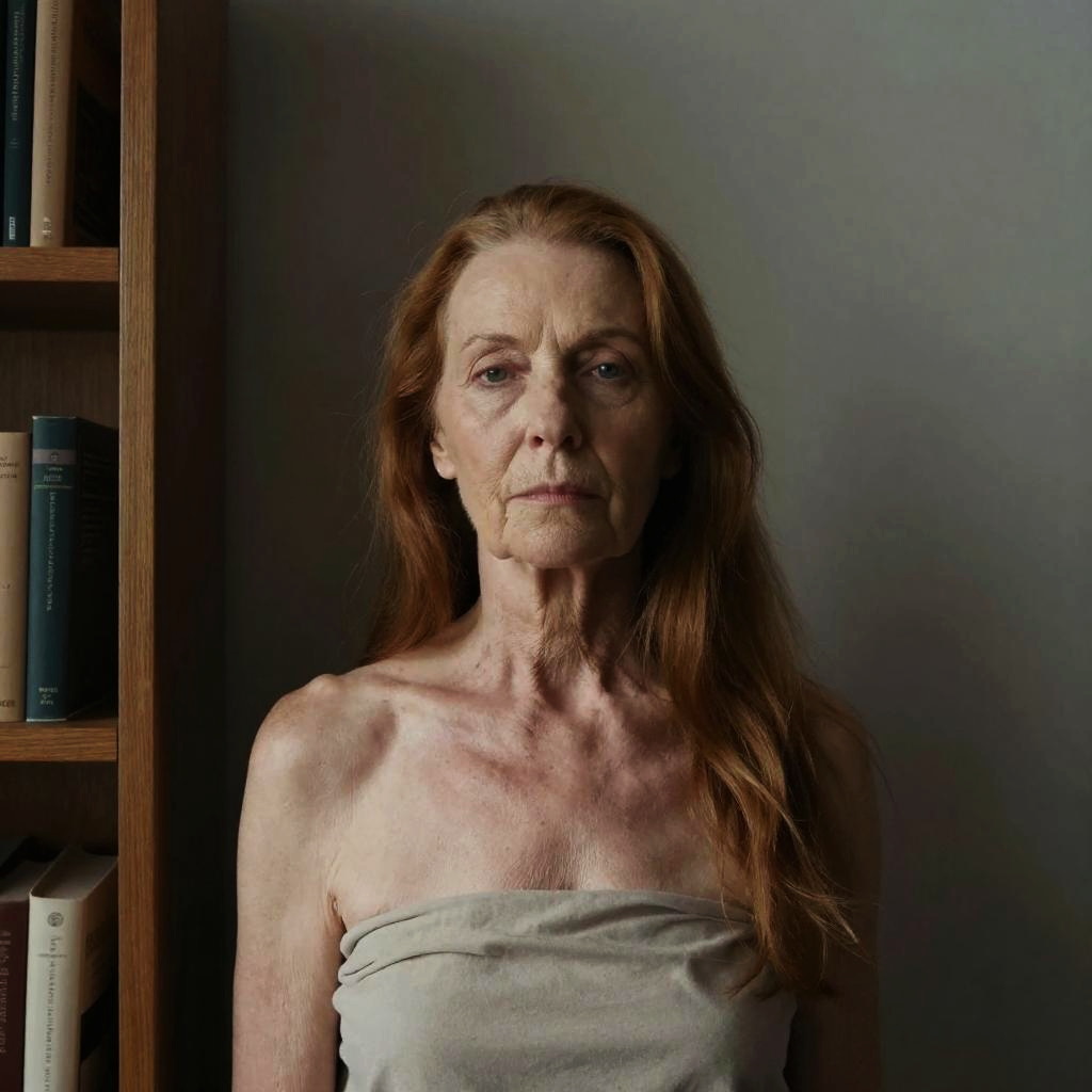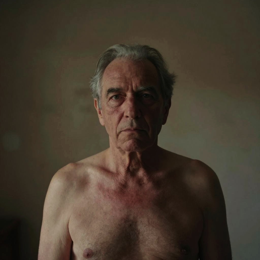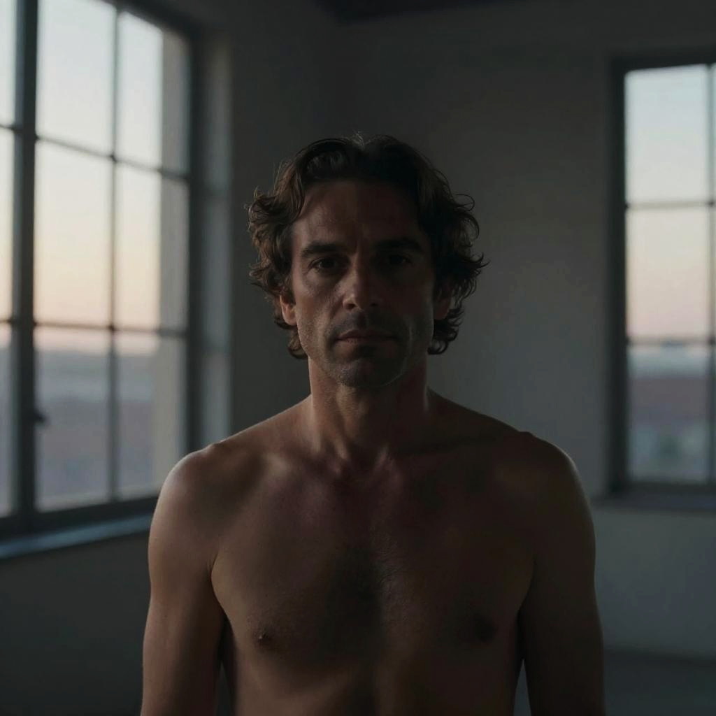 Intimate low-key fine art portrait in dark wooden paneled room lit by a single candle, featuring middle-aged man with reddish skin tone and salt and pepper beard, with a serious, contemplative gaze. Torso modestly draped, shoulders and collarbones revealed, non-explicit. Plain, shadowed backdrop with a subtle gradient from dark to light. soft warm spotlight from low angle with deep shadows, shallow depth, muted palette, minimal props, refined composition, quiet intimacy, modern fine art style.