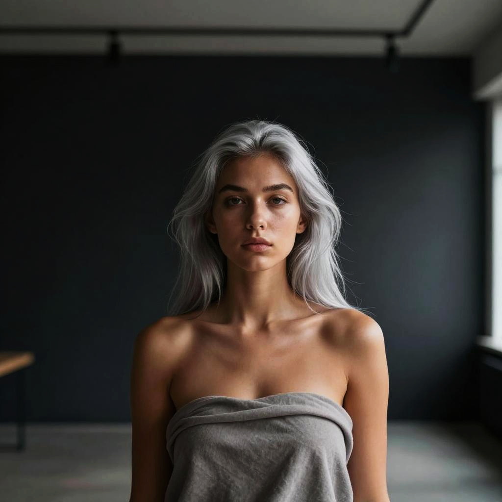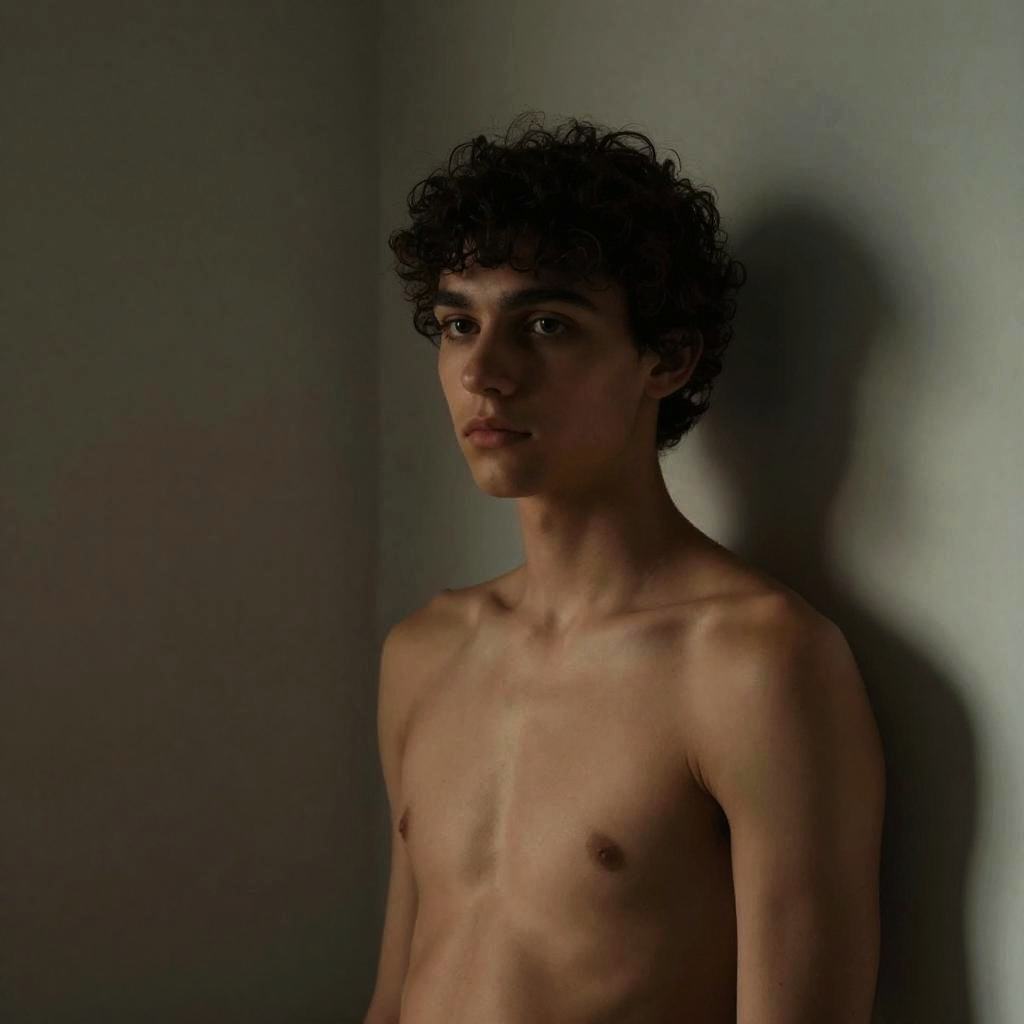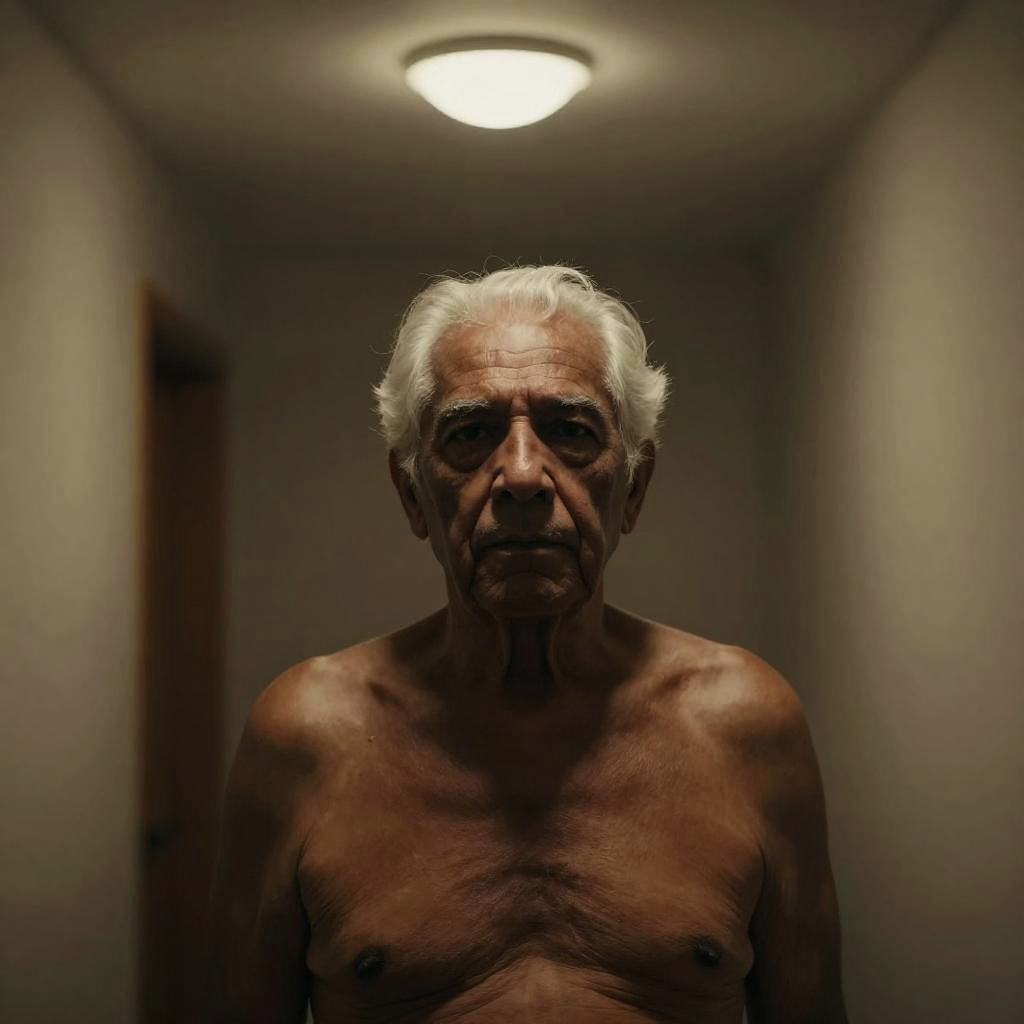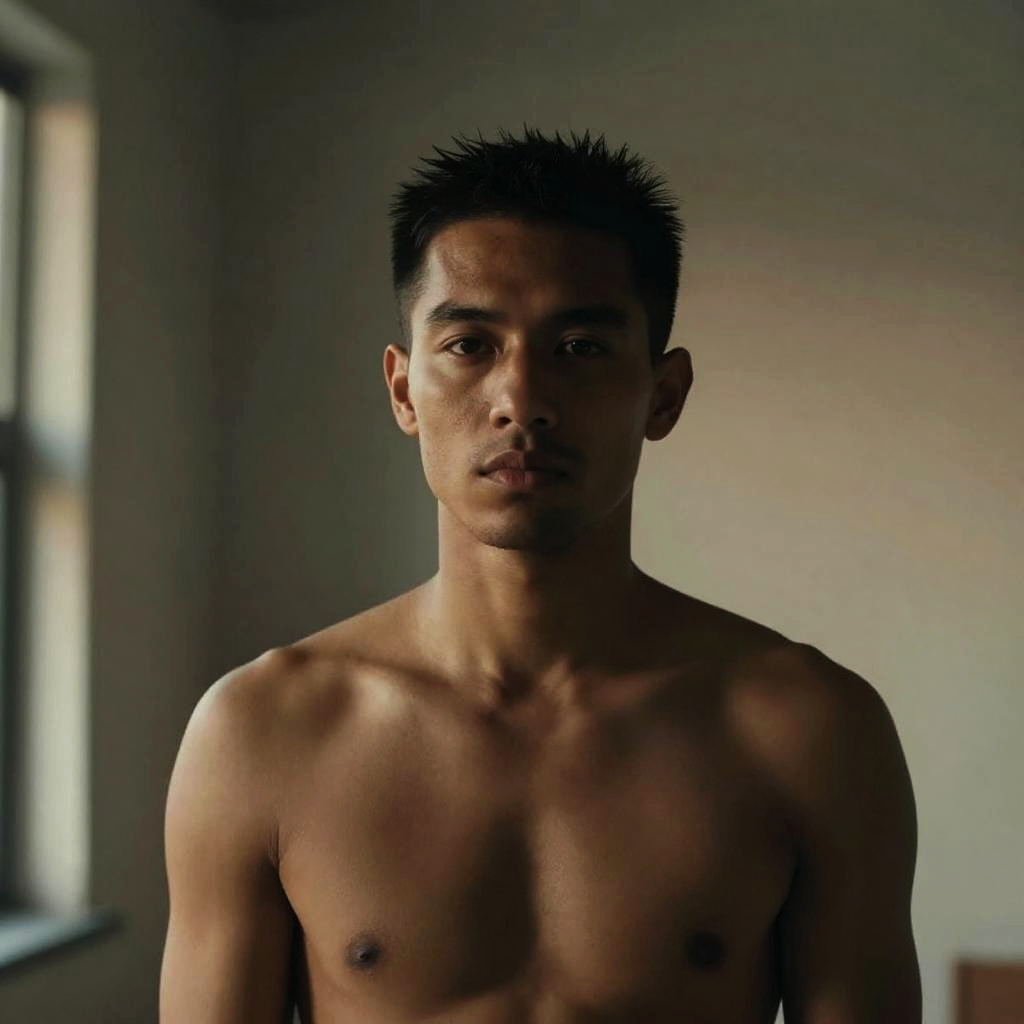 Intimate low-key fine art portrait in dark wooden paneled room lit by a single candle, featuring middle-aged man with reddish skin tone and salt and pepper beard, with a serious, contemplative gaze. Torso modestly draped, shoulders and collarbones revealed, non-explicit. Plain, shadowed backdrop with a subtle gradient from dark to light. soft warm spotlight from low angle with deep shadows, shallow depth, muted palette, minimal props, refined composition, quiet intimacy, modern fine art style.