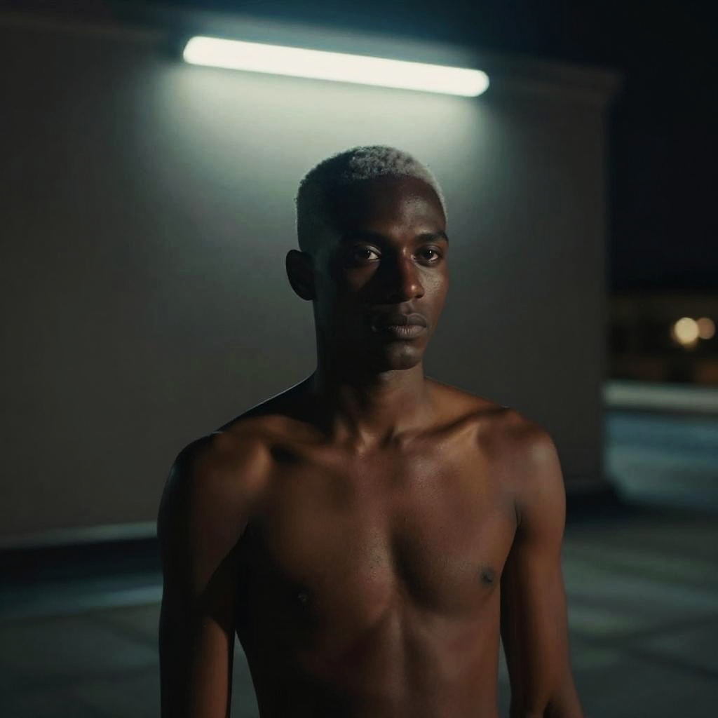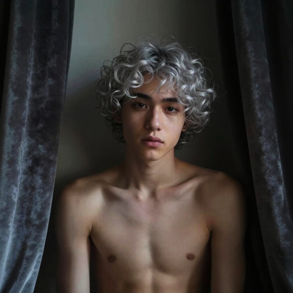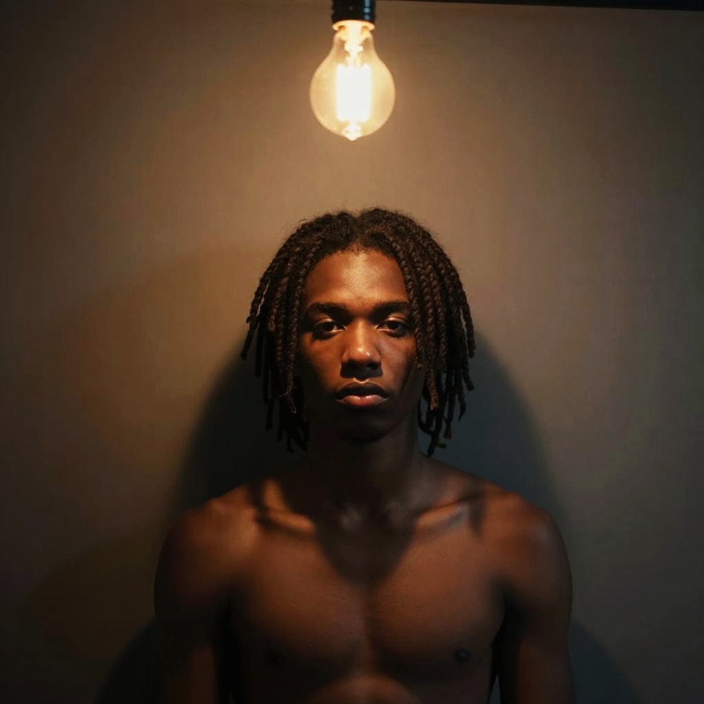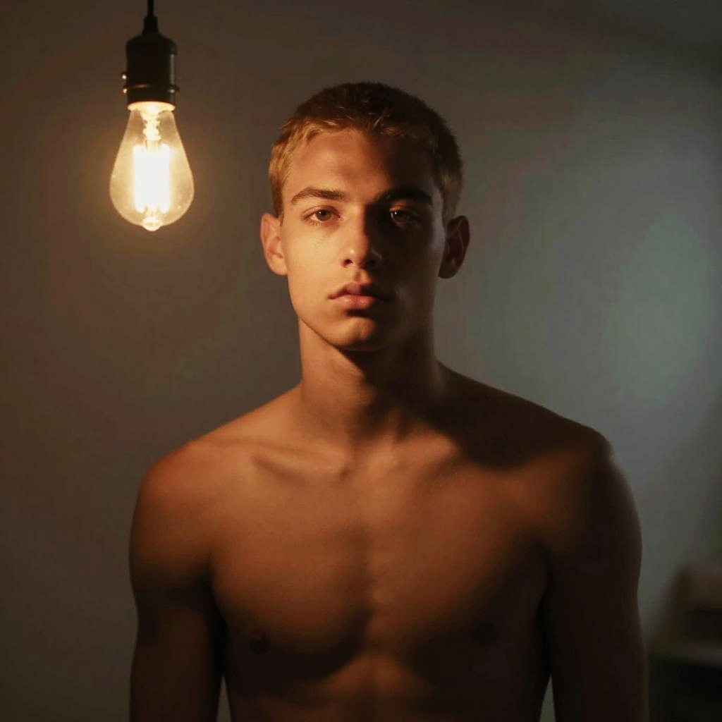 Intimate low-key fine art portrait in dark wooden paneled room lit by a single candle, featuring middle-aged man with reddish skin tone and salt and pepper beard, with a serious, contemplative gaze. Torso modestly draped, shoulders and collarbones revealed, non-explicit. Plain, shadowed backdrop with a subtle gradient from dark to light. soft warm spotlight from low angle with deep shadows, shallow depth, muted palette, minimal props, refined composition, quiet intimacy, modern fine art style.