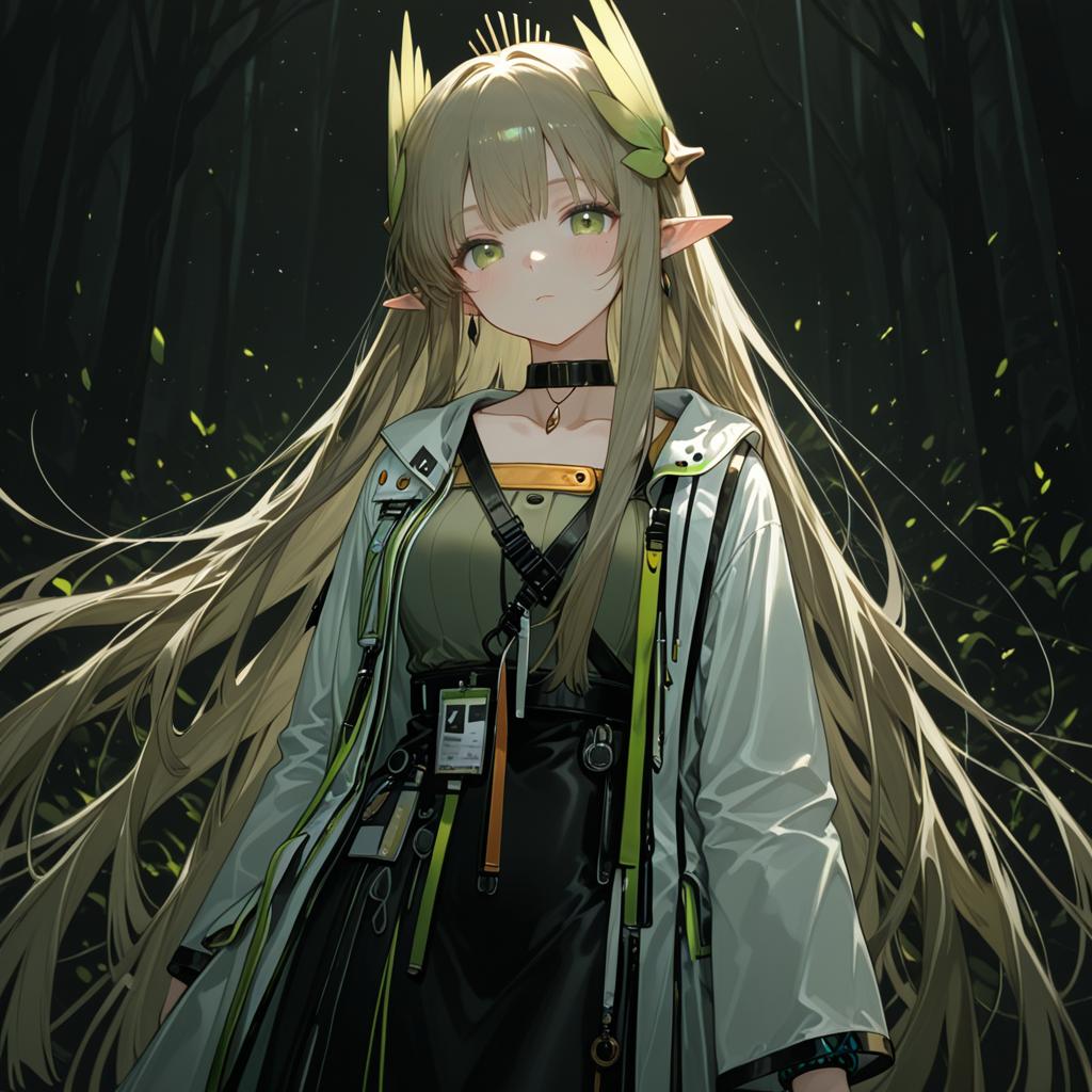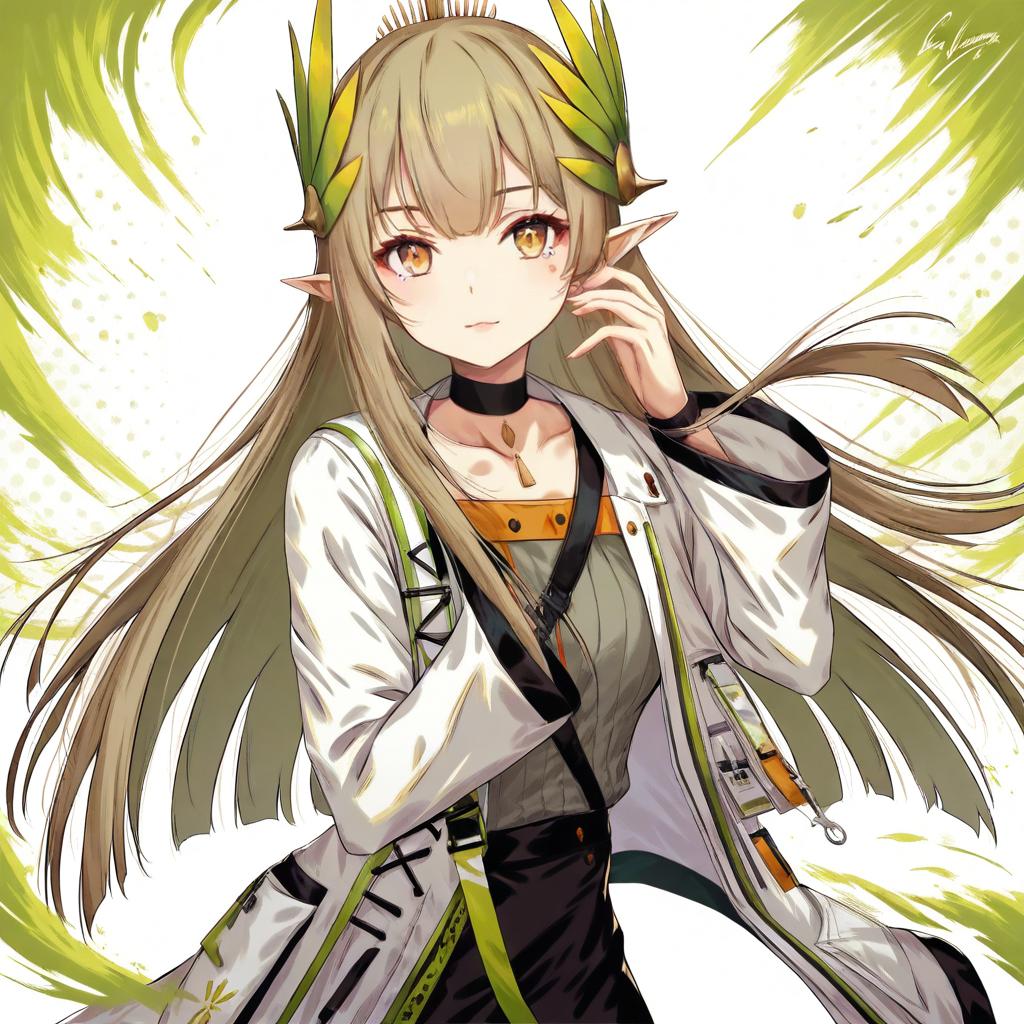 Muelsyse (arknights), arknights, 1girl, pointy ears, yellow eyes, mole under eye, very long hair, brown hair, long hair, long sleeves, black choker, elf, by artist sakiyamama, animagine