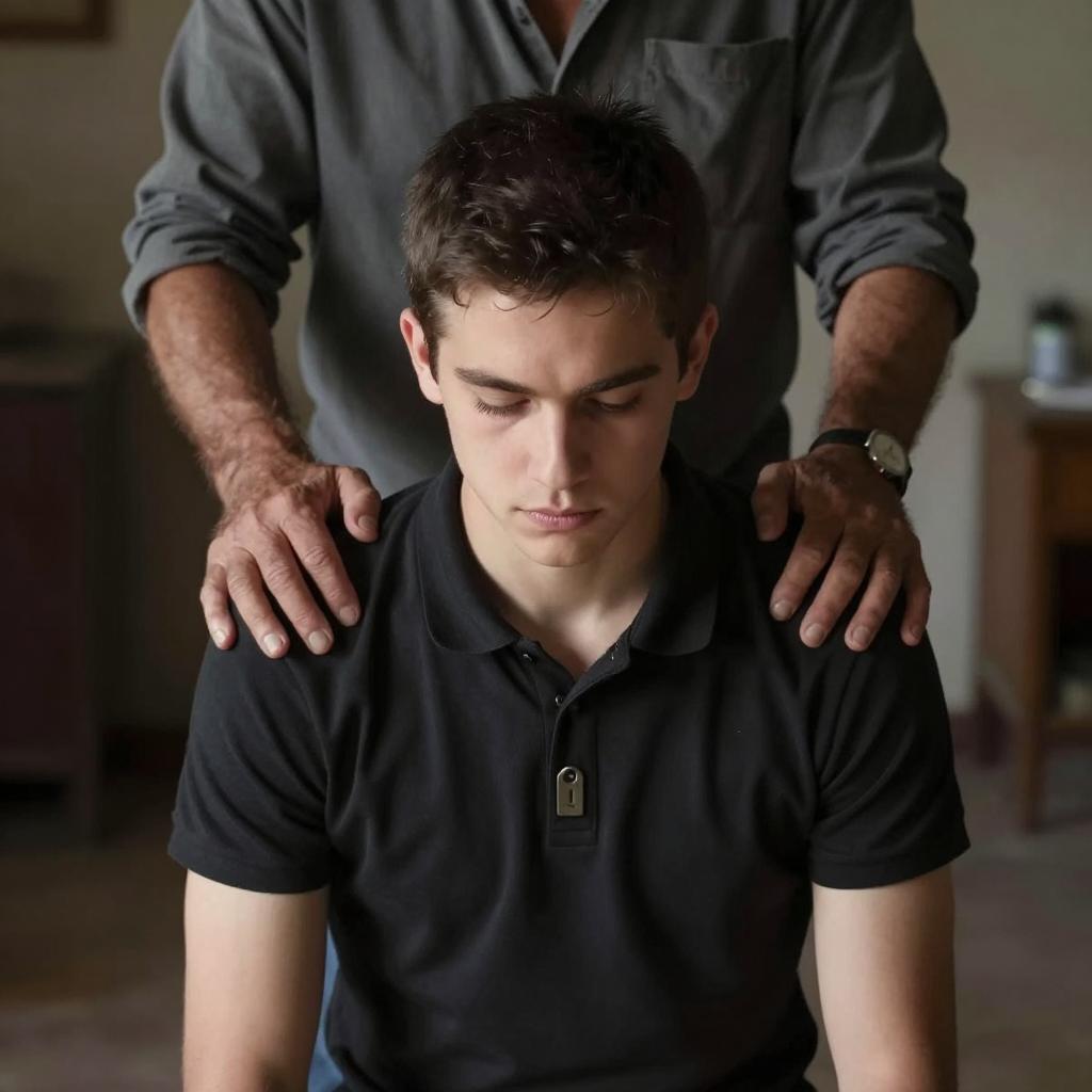 Photograph of two men in an intense scene. Shirtless man with dark hair and muscular build, wearing a blue arm band, grips the chin of a younger man with brown hair and white shirt. Background includes a grey cabinet and dim lighting. Both men have serious, focused expressions. The shirtless man stands behind the younger man, who is seated.