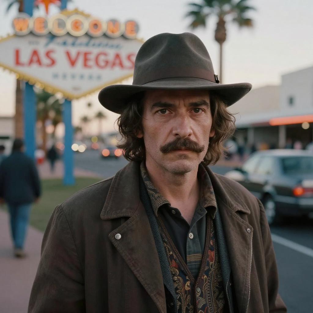 A [busy] Las Vegas city street, inkpunk768, f/1.4, square image, close up film photo, portrait of a sir, atmospheric lighting, cinematic composition, detailed, autumn, filmgenre__