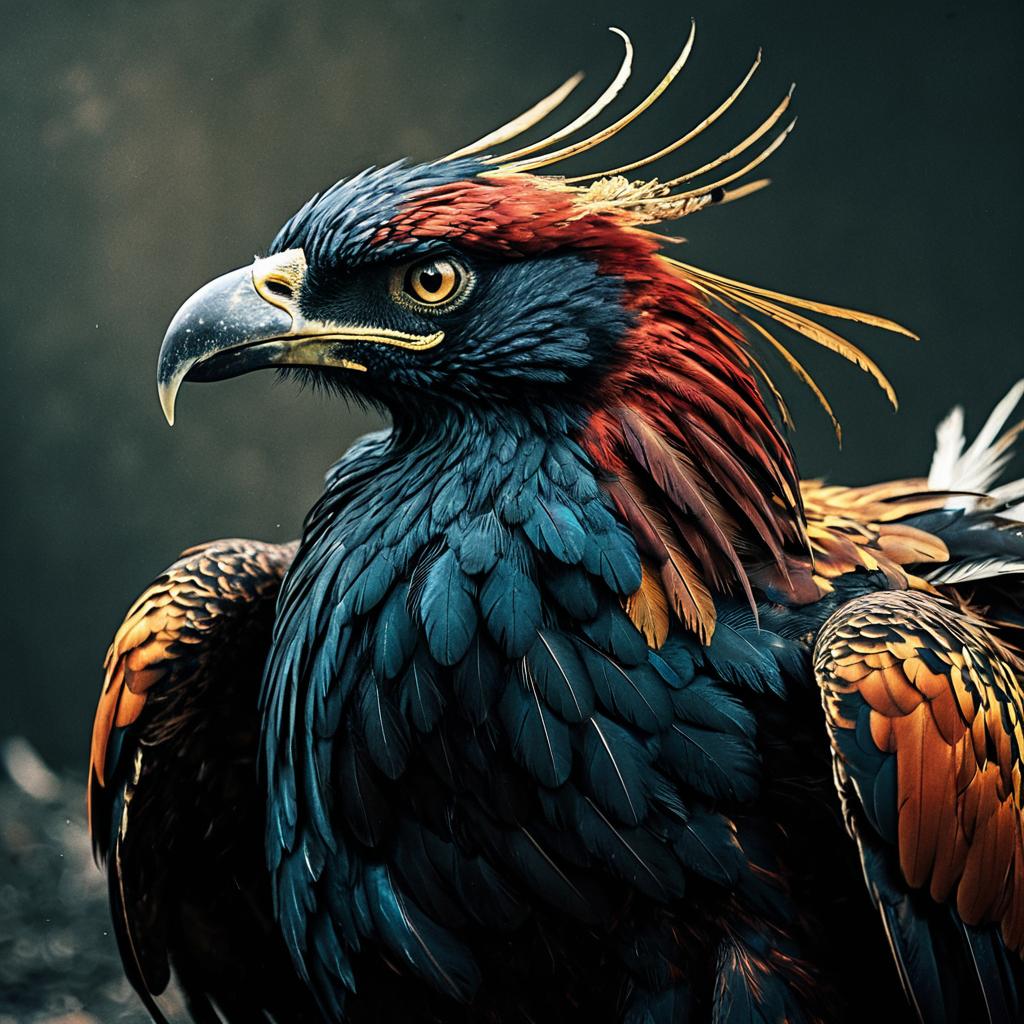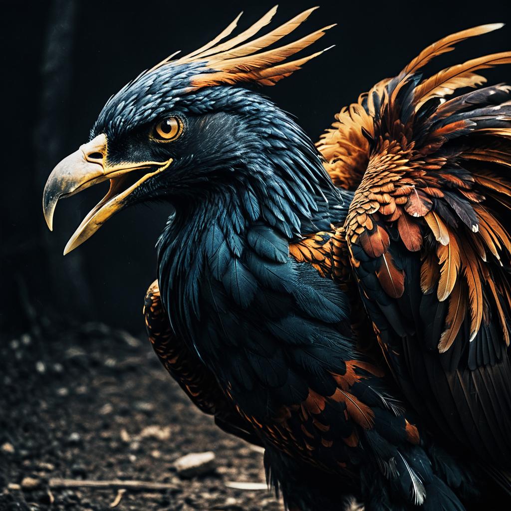 Close-up ultra-detailed photo of a fierce phoenix bird with striking burnished feathers in shades of deep blue and orange, sharp beak open, displaying vibrant plumage and intense gaze, set against a dark blurred background.