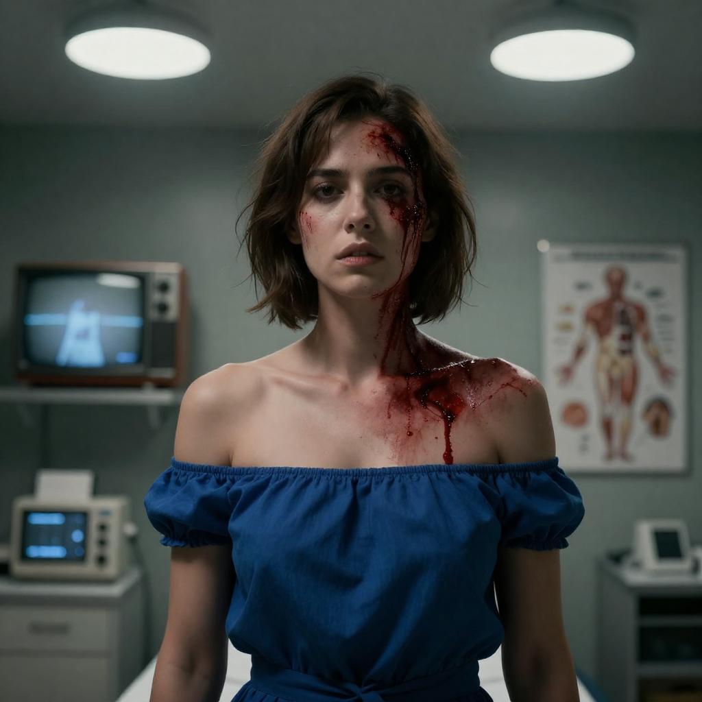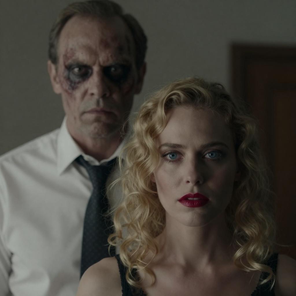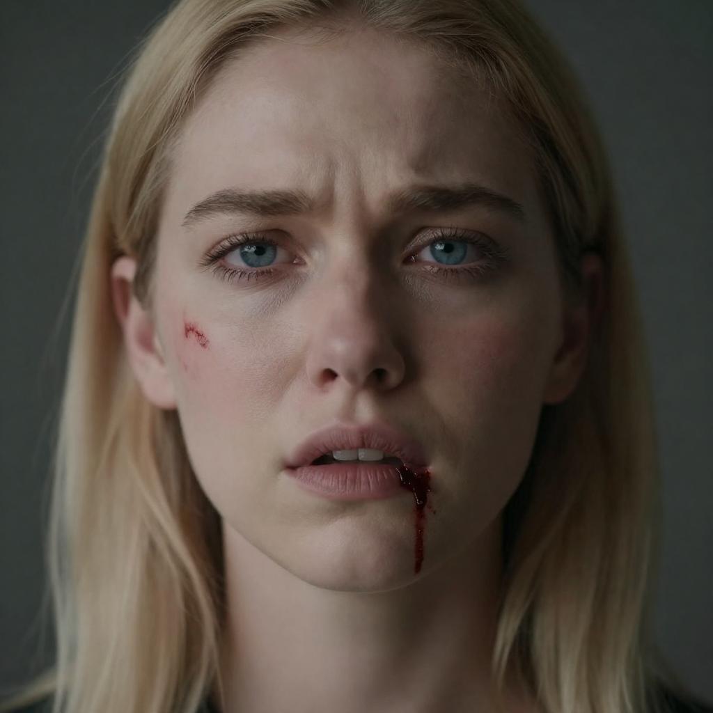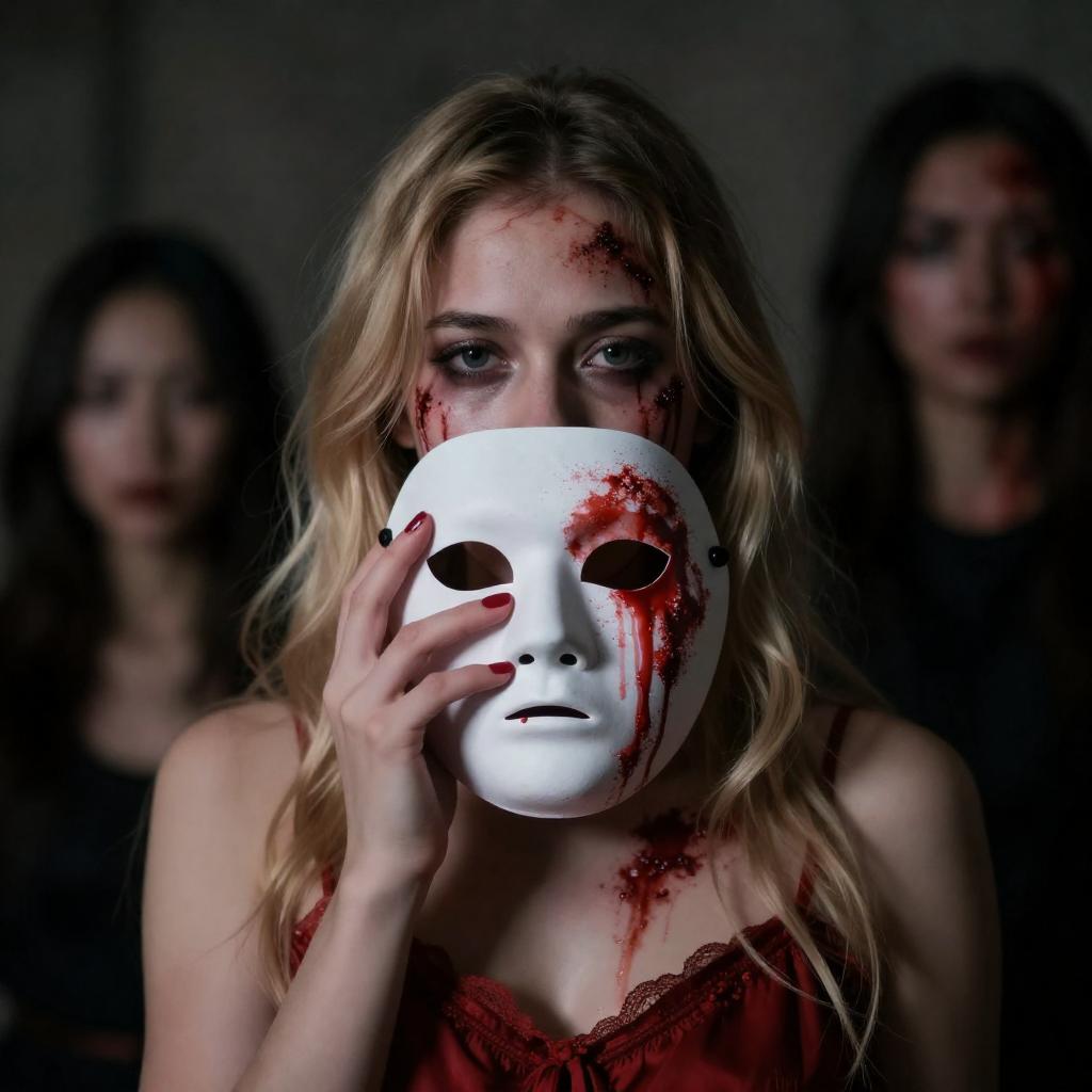 Photograph of a frightened woman with short blonde hair, light gray dress, and brown scarf, hand to neck, looking to the right. Behind her, a large, dark, decayed mask with hollow eyes and bloodstains looms. The mask has a menacing expression. The woman's face shows intense fear.