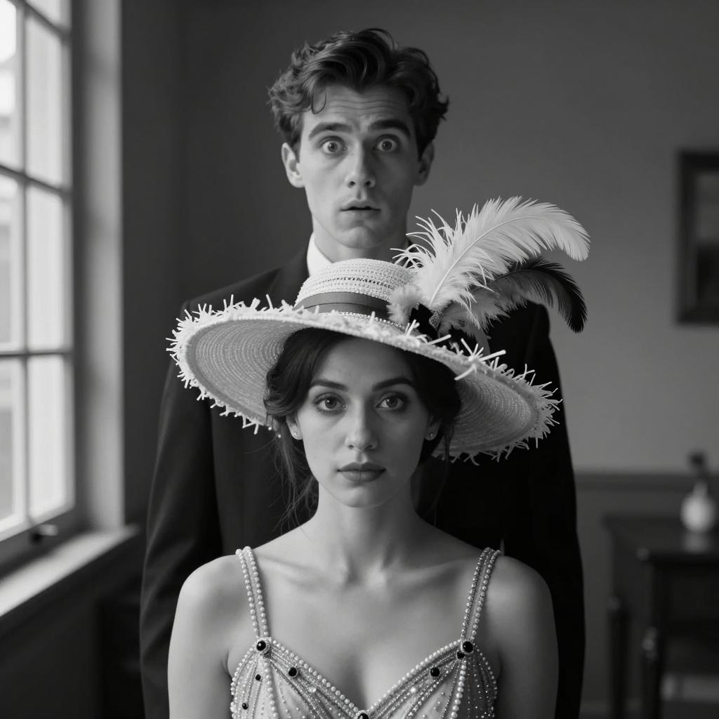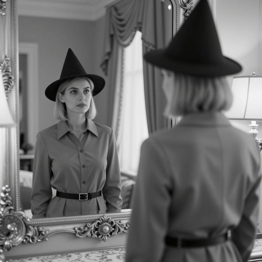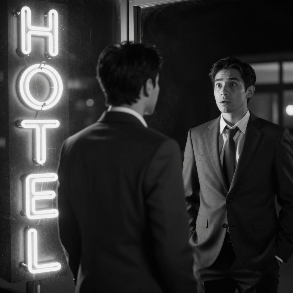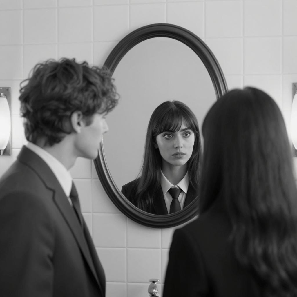 Black and white photo of a man with wavy hair in a suit and tie, looking at a mirror. A woman with straight, dark hair and bangs looks back at him from the mirror. Oval mirror centered between them. Tile wall in background. Man's profile on left, woman's face in mirror on right.