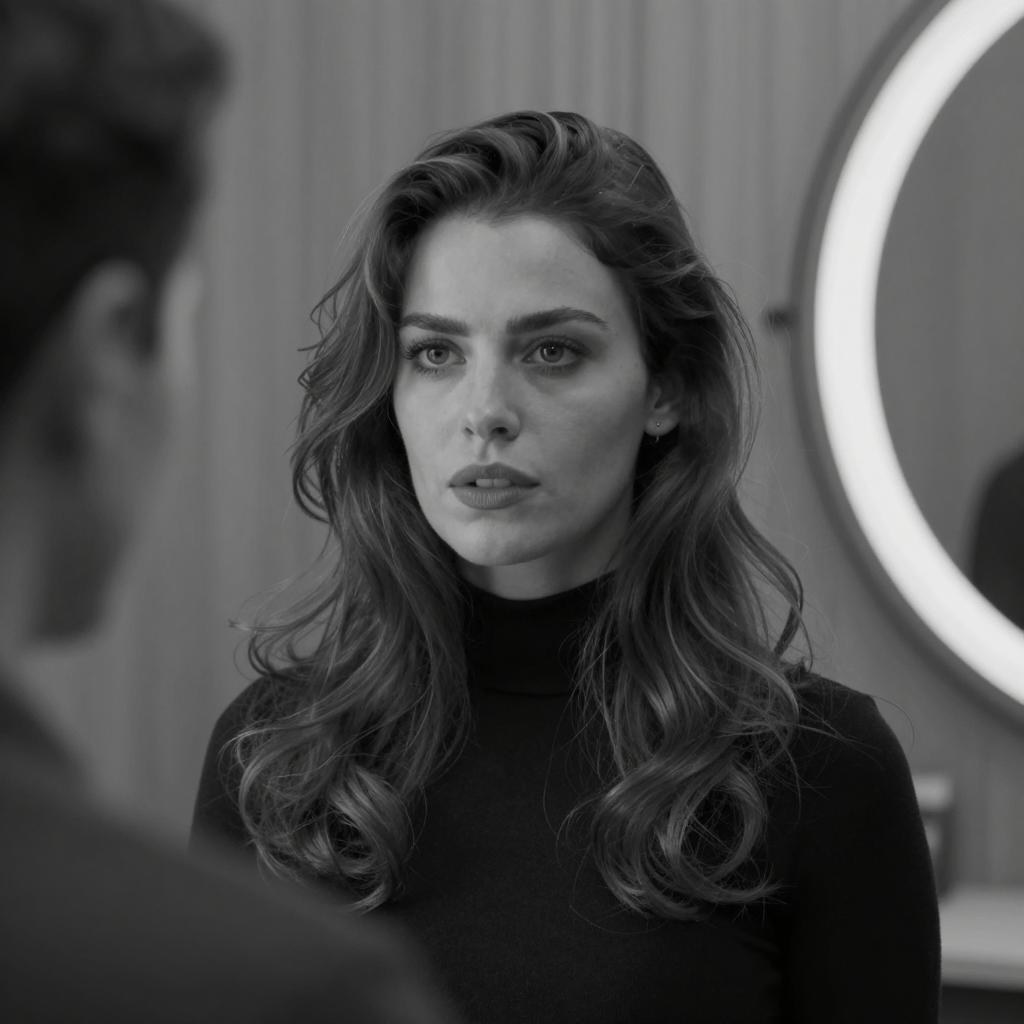 Black and white photo featuring a man with wavy hair dressed in a suit and tie, facing an oval mirror where the reflection of a woman with straight dark hair and bangs is visible. The background shows a tiled wall with two wall-mounted lights on either side of the mirror.