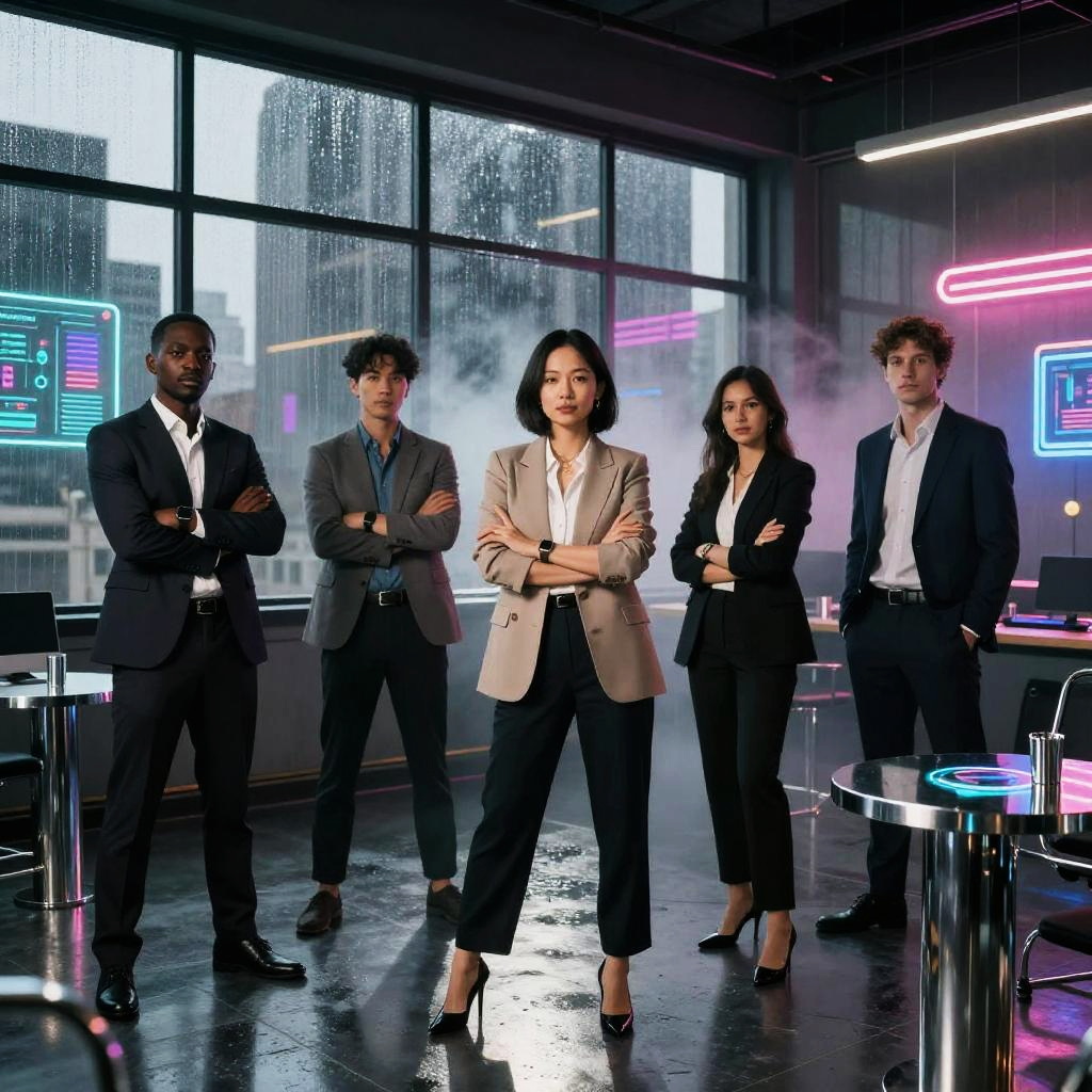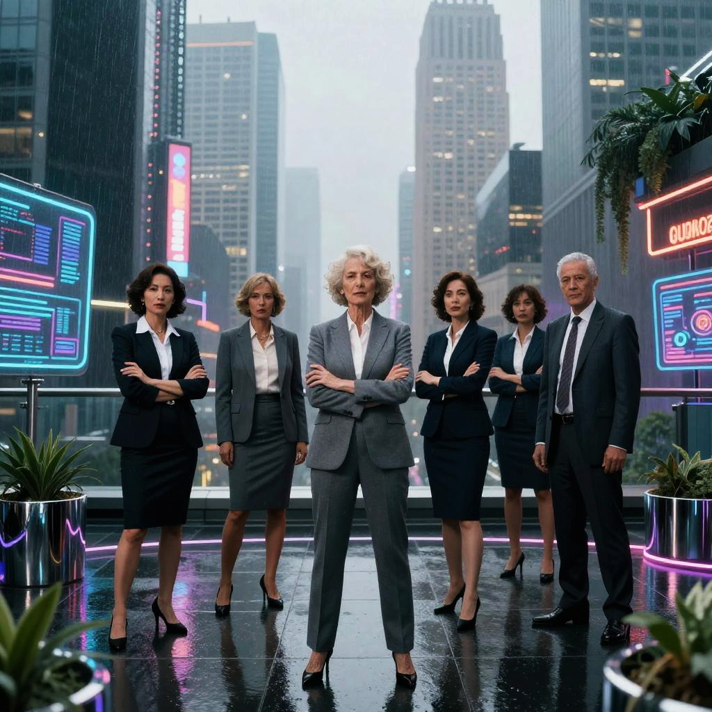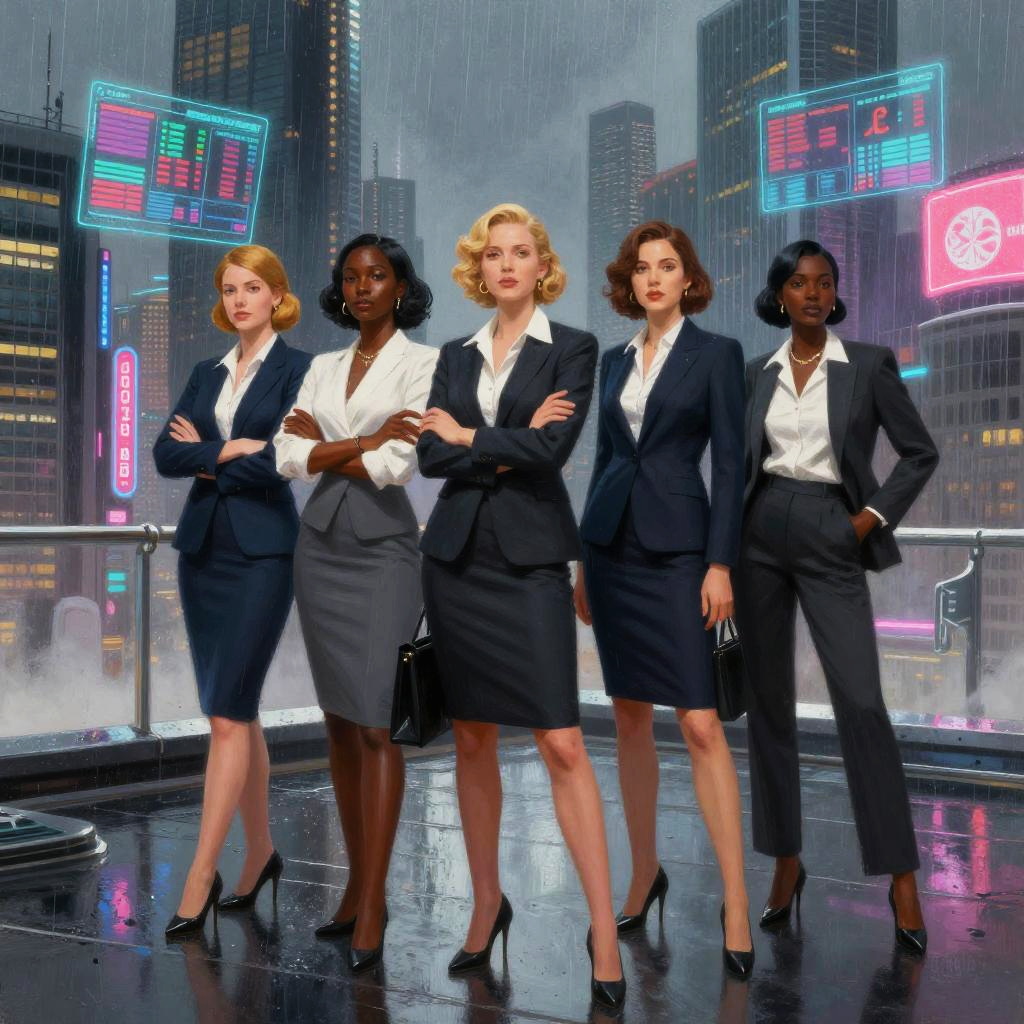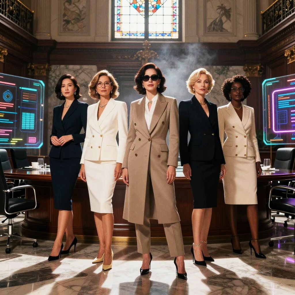 Futuristic art-deco digital watercolor, high-detail 4k, warm cinematic rim lighting, subtle film grain, crisp precise edges portrait series of elegant robotic dancers in gilded ballroom with stained glass windows, holographic dashboards, reflective chrome and glass, neon signage, dramatic rim light, atmospheric fog, clean outlines and precise edges, confident expressions and executive fashion, high contrast, subtle noise, long shadows, futuristic corporate aesthetics