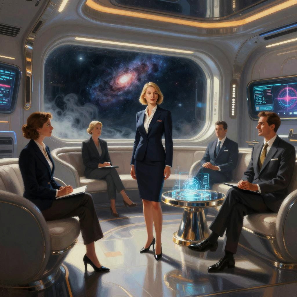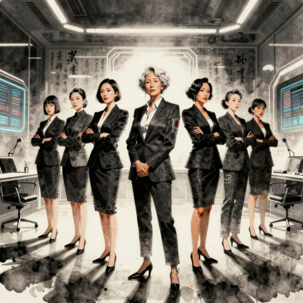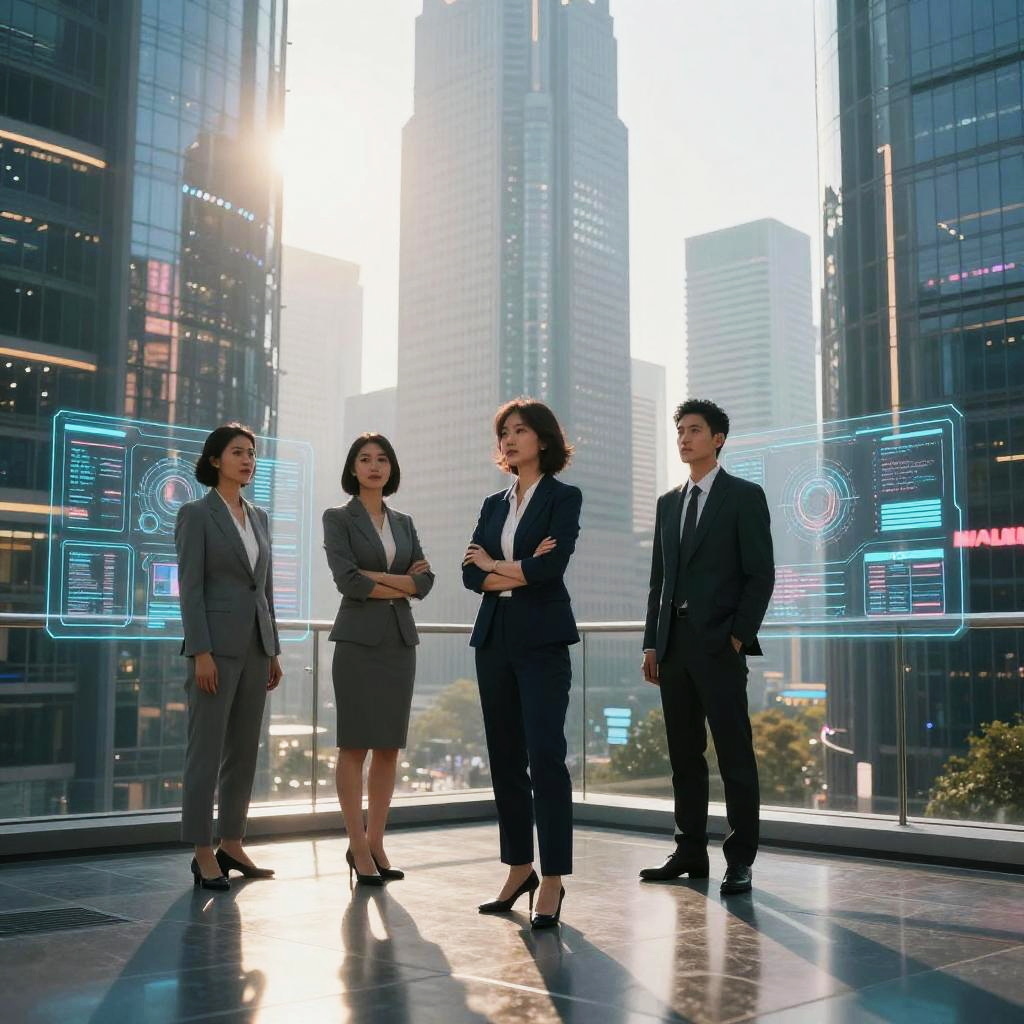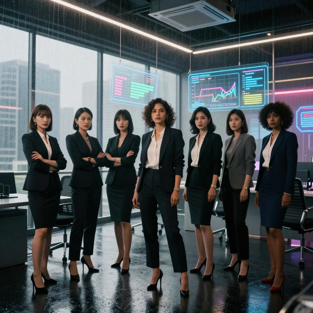 Futuristic art-deco digital watercolor, high-detail 4k, warm cinematic rim lighting, subtle film grain, crisp precise edges portrait series of elegant robotic dancers in gilded ballroom with stained glass windows, holographic dashboards, reflective chrome and glass, neon signage, dramatic rim light, atmospheric fog, clean outlines and precise edges, confident expressions and executive fashion, high contrast, subtle noise, long shadows, futuristic corporate aesthetics