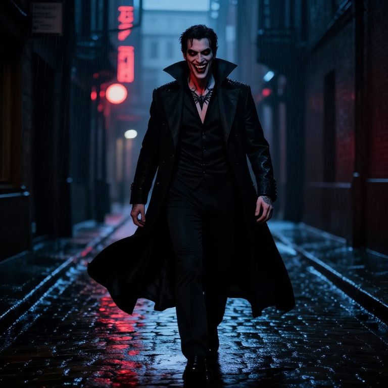 Photograph of a dark-haired man with pale skin and sharp features, wearing a long, black, open-collared trench coat over a black shirt. He has a mischievous grin, revealing sharp teeth, and is walking down a wet, cobblestone alley at night. Neon red and blue lights cast a colorful glow on the wet pavement. The background features blurred buildings with additional neon signs, creating a moody, urban atmosphere reminiscent of a noir or dystopian scene. The man's confident stride and the vivid lighting enhance the dramatic, cinematic feel of the image.