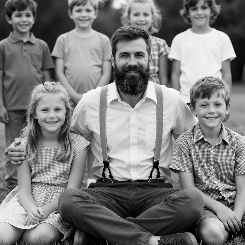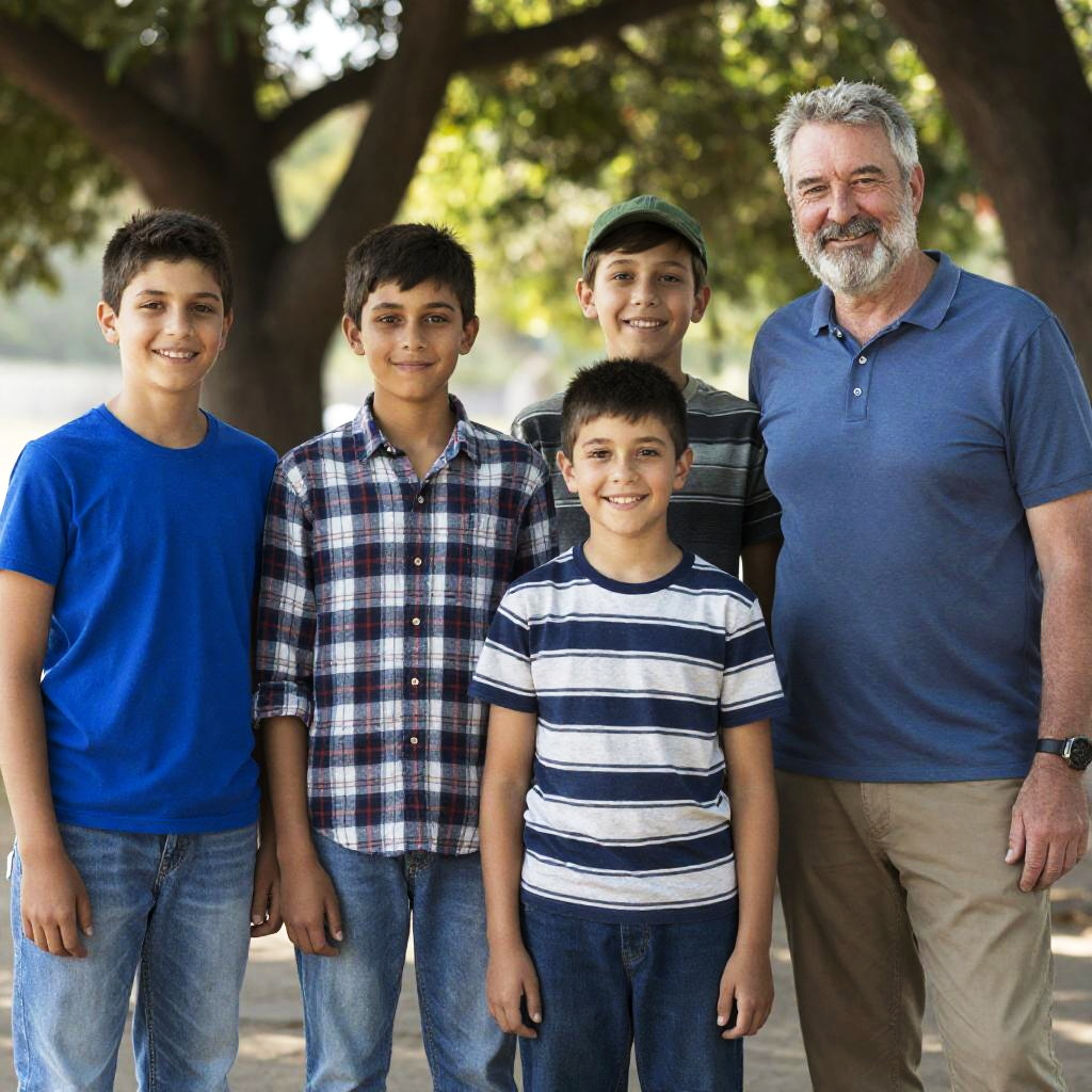 Photograph of five people standing outdoors. An older man with gray beard and blue shirt stands to the right, leaning slightly. Four boys stand to his left; one wears a blue shirt and jeans, another in a plaid shirt, the third in a striped shirt, and the fourth in a green cap. Background features trees with dappled sunlight. Boys have relaxed, happy expressions, while the older man has a content smile.