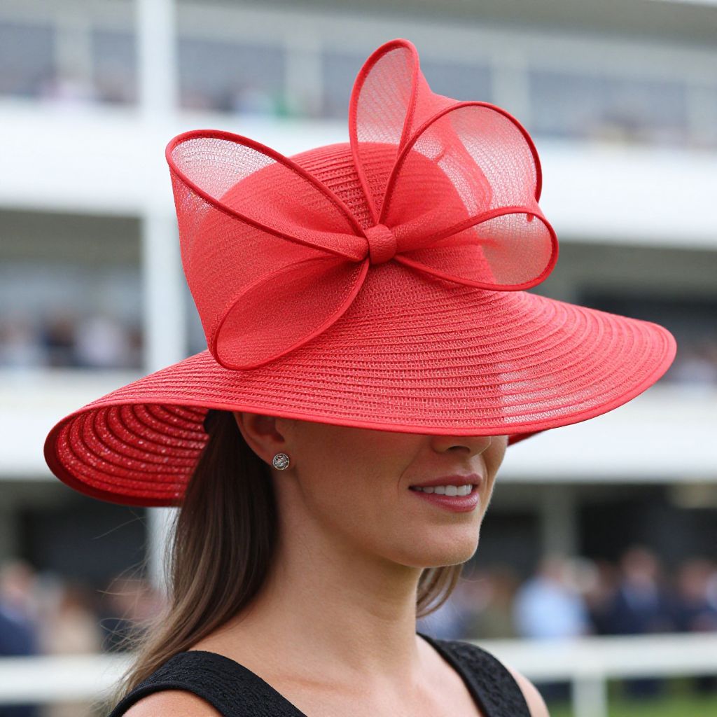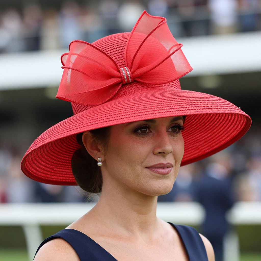 Woman wearing a vibrant red wide-brimmed hat adorned with a large bow, styled for Melbourne Cup Ascot Derby races, available for purchase online in Australia as S970R.