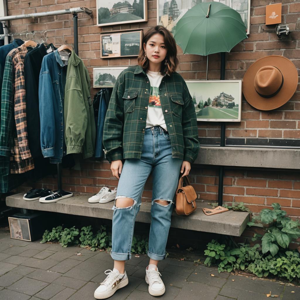 Photo of a Curvy woman, A-Line Bob, 90s outfit, baggy ripped jeans in Moss Green, oversized flannel shirt in Corduroy, graphic t-shirt, denim jacket, leather sneakers, grunge style, plaid patterns, muted colors, casual, vintage, retro, 1990s fashion, Cafe with umbrellas, lomography style