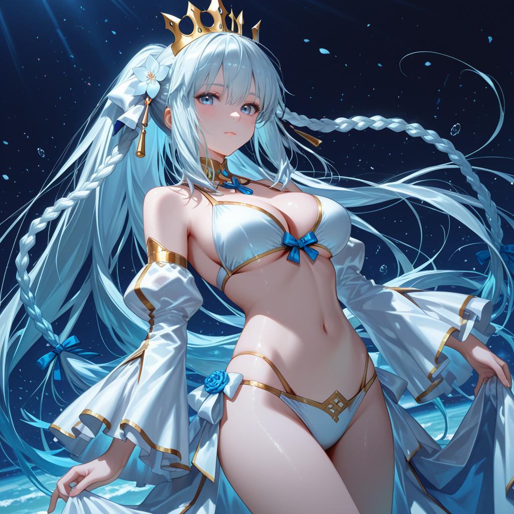 Digital illustration of a female anime character with very long light blue hair styled in twin braids and french braid, adorned with flowers and ribbons. She has blue eyes and wears a white bikini with gold trim, detached puffy long sleeves, a gold crown, and decorative accessories. The character is posed against a dark aquatic background, embodying a regal water princess theme.
