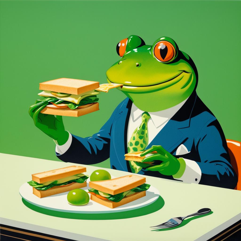 Lithograph of an anthropomorphic frog eating a sandwich.