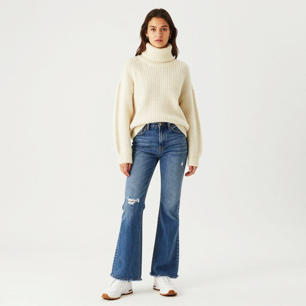 Shaggy Fringe hairstyle on non-binary model, wearing oversized hand-knit sweater and tailored cargo pants, in minimalist sunlit loft with large industrial windows, captured in fashion editorial style with soft morning window light with subtle lens flare.