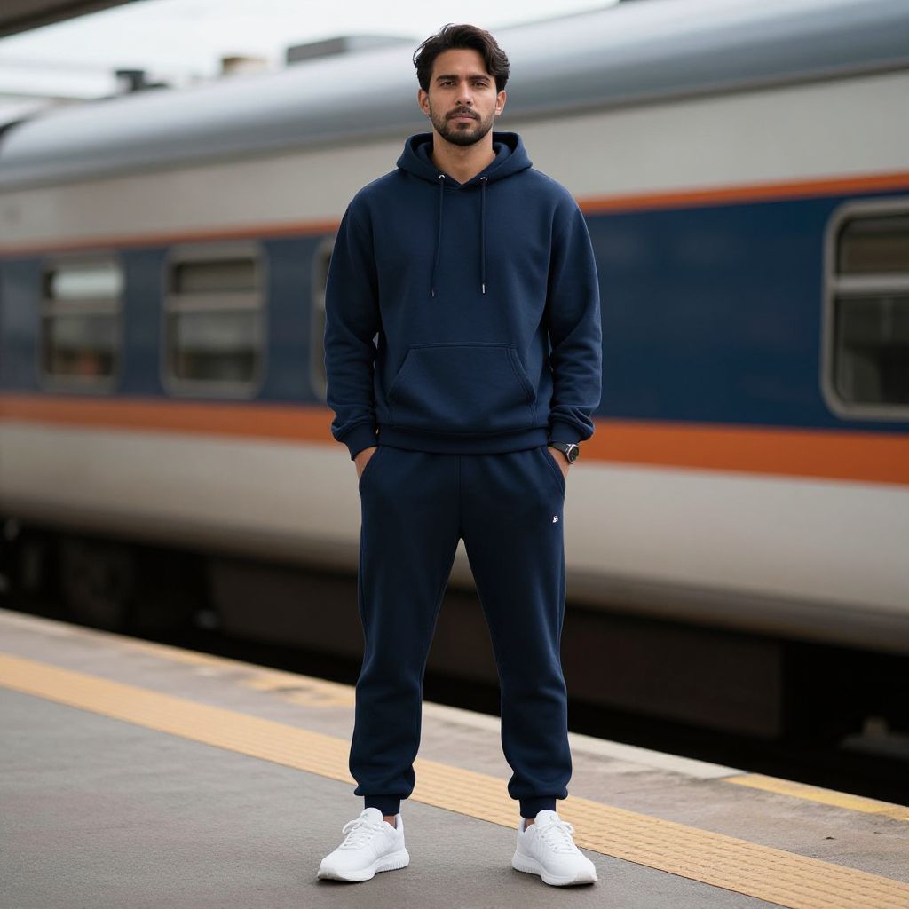 Sweat Suits Costume, man standing on the train platform with his hands in his pockets
