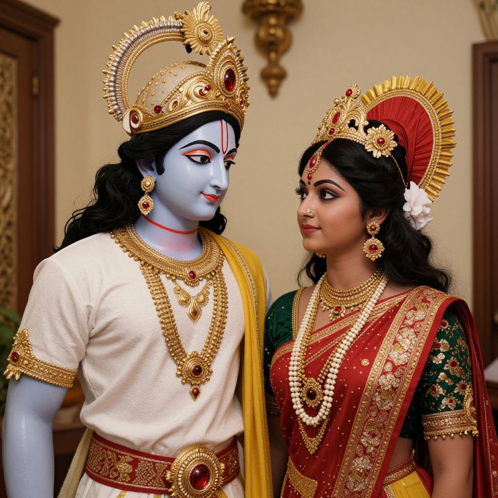 Photograph of a blue-skinned male god and a dark-haired woman in traditional Indian attire with gold jewelry and ornate headdresses, standing close in