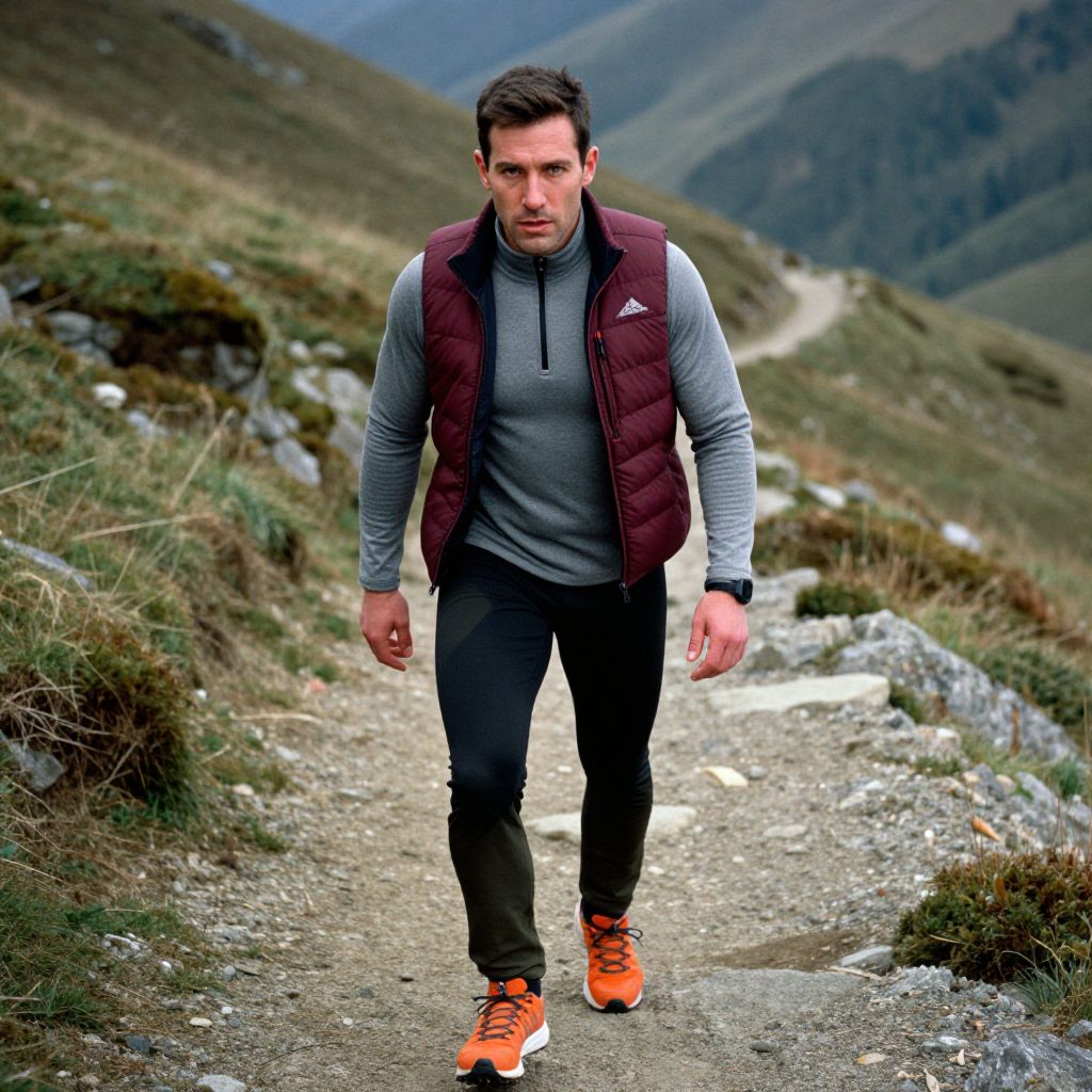Photograph of a Caucasian man with short brown hair and a medium build, walking on a rocky mountain trail. He wears a maroon puffer vest over a gray long-sleeve shirt, black pants, and bright orange running shoes. The background features a grassy, rocky mountain landscape with a winding path and distant hills. The man looks focused, with his hands relaxed by his sides. The image has a slightly blurred, colorful, and vibrant style, emphasizing the outdoor setting and the man's athletic attire.
