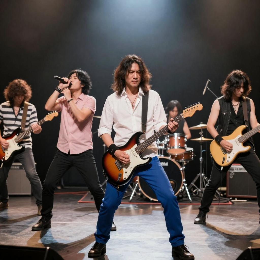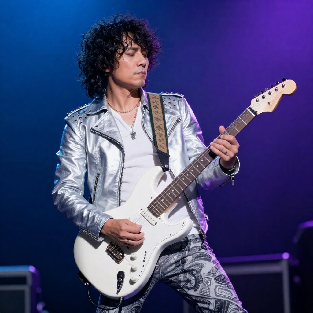 Male rock musician with curly black hair, closed eyes, wearing a silver jacket with studded shoulders, white shirt, and patterned pants, playing a white electric guitar. Blue and purple stage lights in the background. Dynamic, intense performance pose.