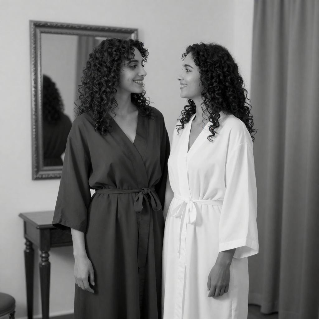 Black-and-white photograph of two women in a room. Standing woman with dark hair in a black dress helps seated woman with light hair in a white dress tie her shoe. Curtains, lamp, and chair in background. Seated woman looks down, standing woman looks at her hands.
