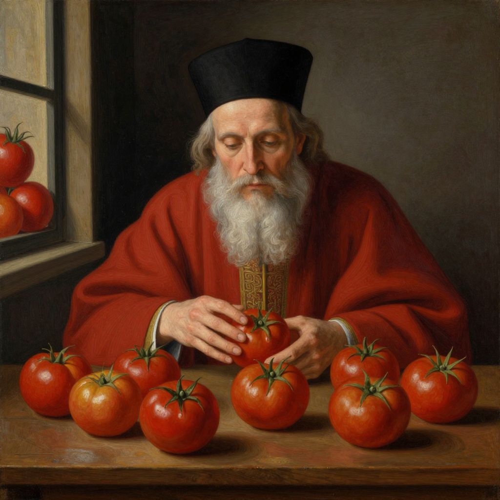 In this detailed painting, a bearded man, dressed in a red robe and a black cap, is depicted with a solemn expression as he gazes upon a collection of tomatoes. The man's long, white beard and the intricate details of his robe suggest a figure of wisdom or religious significance. The tomatoes, varying in size and ripeness, are arranged in a semi-circle on a wooden table, creating a sense of order and focus. The vibrant red of the tomatoes contrasts sharply with the muted tones of the man's robe and the dark, shadowy background, drawing the viewer's attention to the central figure. The man's hands, gently holding a tomato, convey a sense of reverence and contemplation. In the background, a window reveals a continuation of the tomato display, adding depth to the scene. The overall composition, with its careful arrangement of objects and the interplay of light and shadow, creates a serene and contemplative atmosphere.