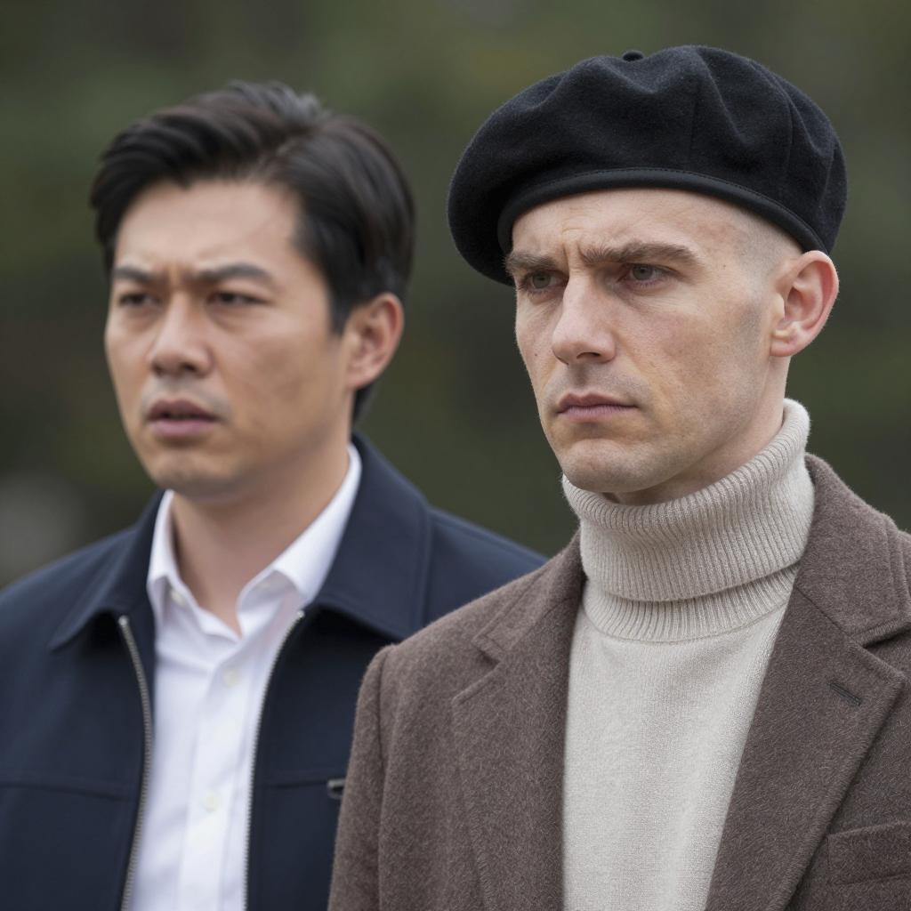 Photograph of two men. Foreground: dark-haired man with medium-length hair, serious expression, black leather jacket with beige lining, white shirt. Background: blond man with styled hair, sunglasses, red jacket over yellow shirt, neutral expression. Both look slightly to the left. Urban setting, blurred background.