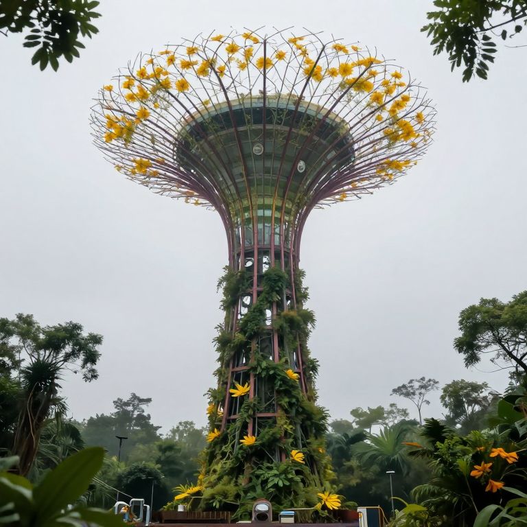 In a misty woodland, a towering structure ascends like a living clockwork, its spiraling tiers adorned with verdant vines and crowned by a radiant, sunburst-like canopy of golden flowers, defying the boundaries between nature and machinery.