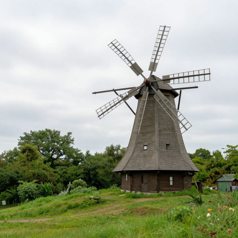Photograph of a rustic wooden windmill with a conical roof and large, lattice-like blades. The windmill is dark brown and stands on a grassy hill surrounded by lush greenery and trees. The sky is overcast, with a white, cloudy backdrop. A small, green shed is partially visible to the right. The foreground features a dirt path and vibrant wildflowers, adding color to the green landscape. The overall scene evokes a serene, countryside atmosphere.