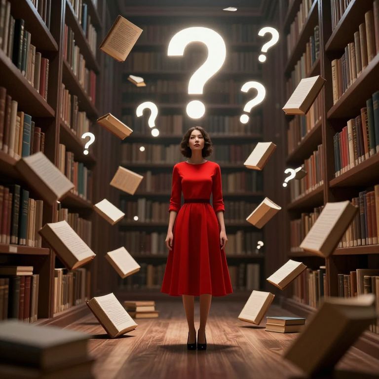 Photograph of a woman in a red dress standing in a library aisle, surrounded by floating books and glowing question marks.