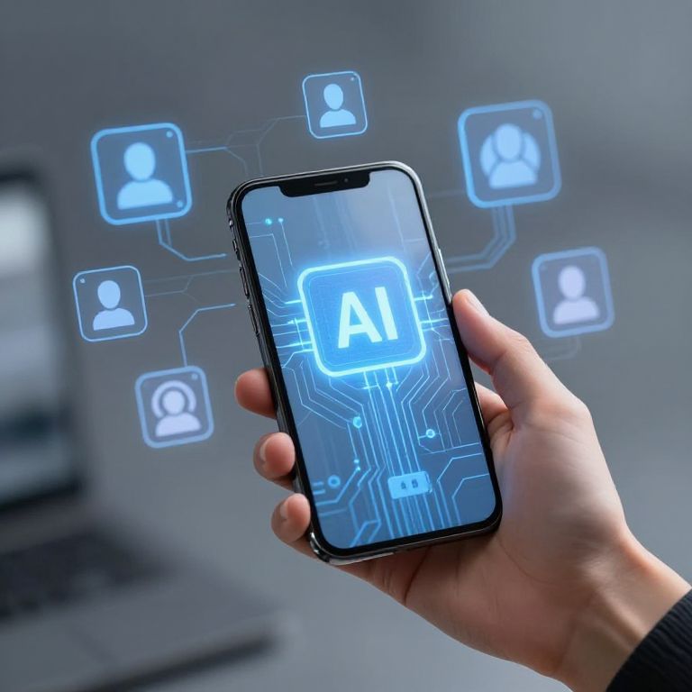 Photograph of a hand holding a smartphone displaying "AI" icon, with glowing blue user profile icons floating around, against a blurred gray background.