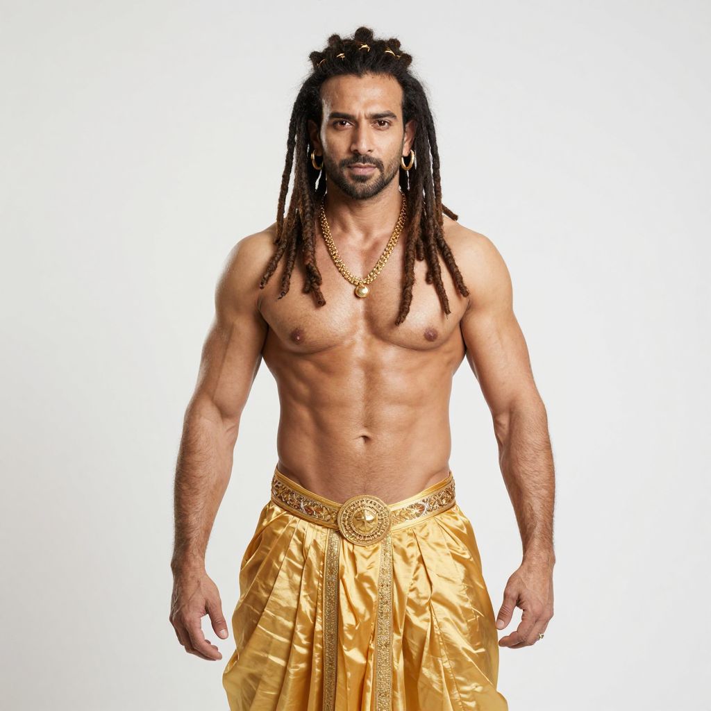 A hyper-realistic, muscular man with long, spikey dreadlocks, wearing gold earrings, a gold necklace, and Indian silk pants, exudes an Indian hunk God vibe.