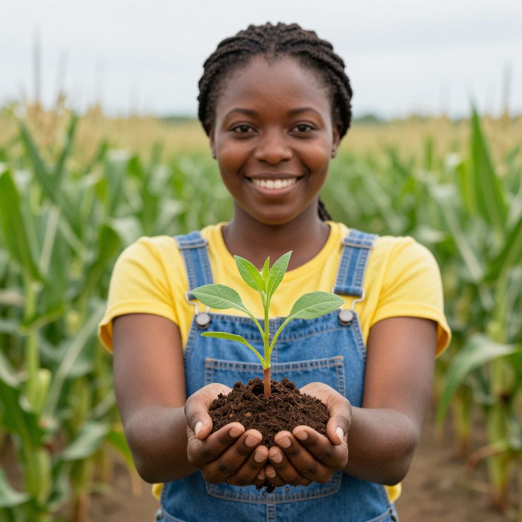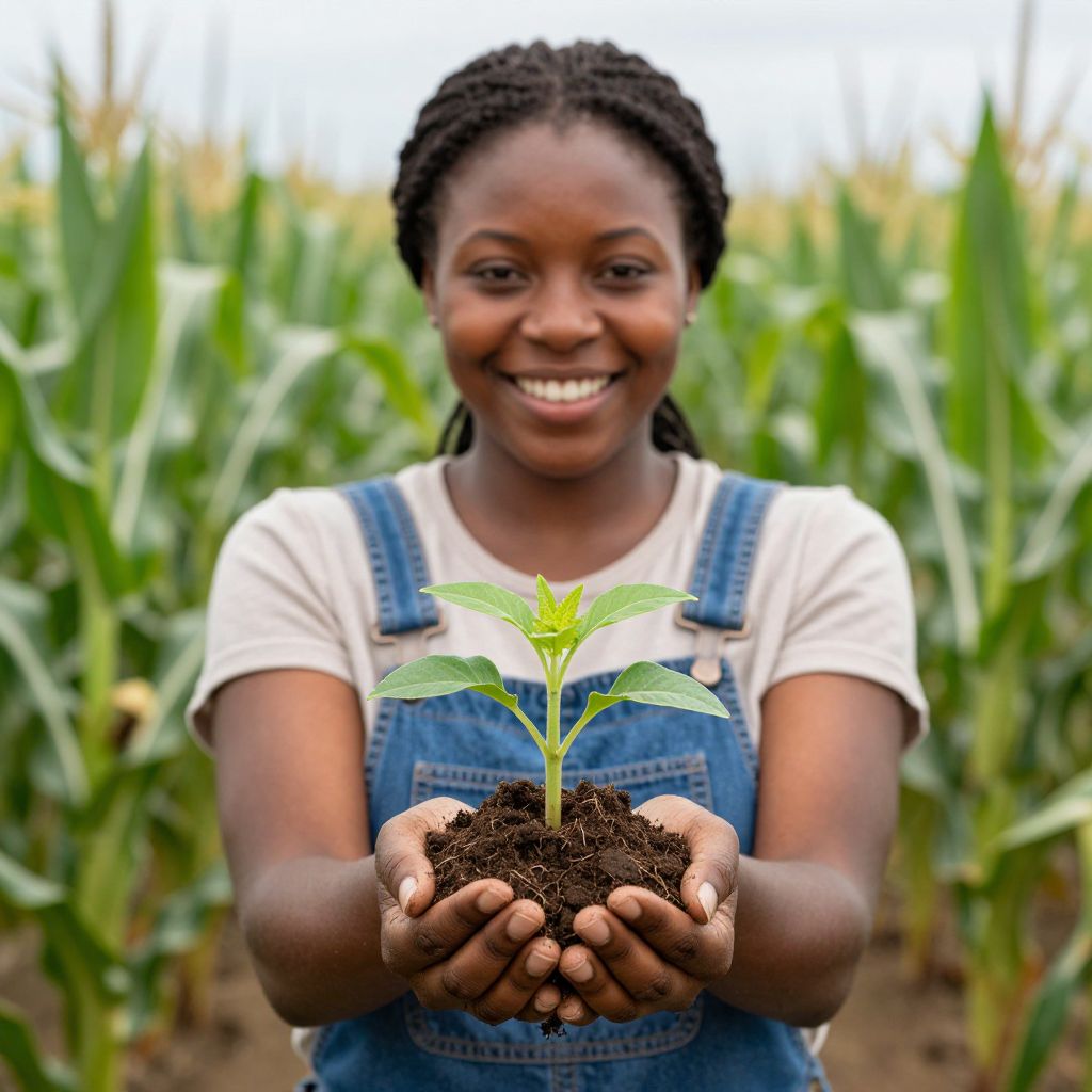 Smiling Black woman farmer holding a small green plant with rich brown compost soil in her hands, set against a vibrant backdrop of lush cornfields.