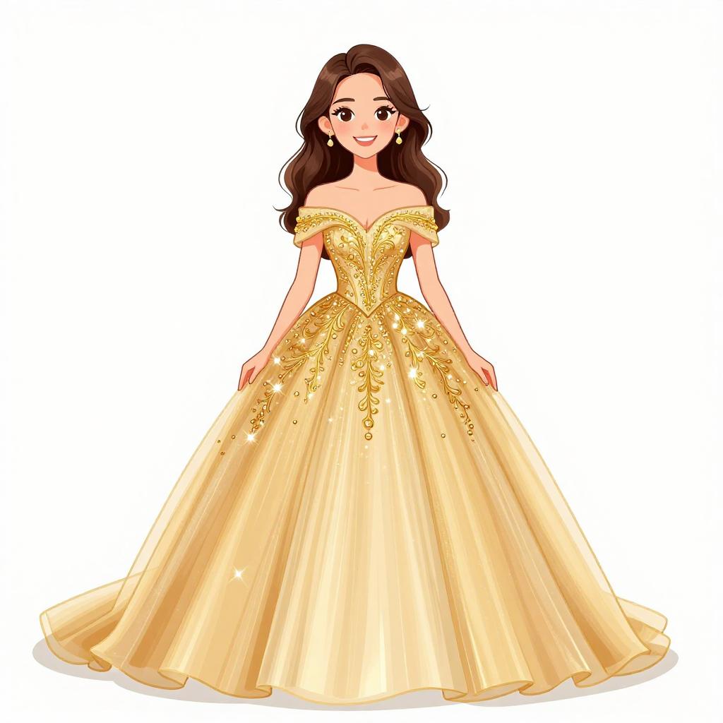 Woman with pretty face and pretty hair. smiling Woman, romantic glamour, blush pink evening gown, sheer tulle overlay, beaded bodice with intricate patterns, V-neckline with sheer insert, cold shoulder with short embellished sleeves, fitted waistband, full and airy floor-length skirt, plain background. --sref 1467