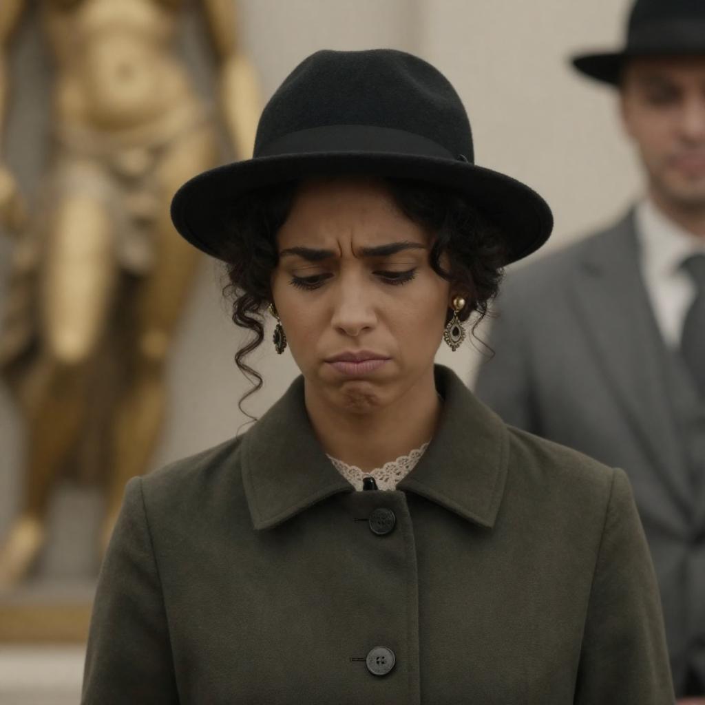 Photograph of a woman with dark, curly hair wearing a black hat and dark green jacket, looking downward with a slight frown. She has ornate earrings and a lace collar. Background includes a golden statue and a man in a grey suit with a hat, partially visible. Warm lighting.
