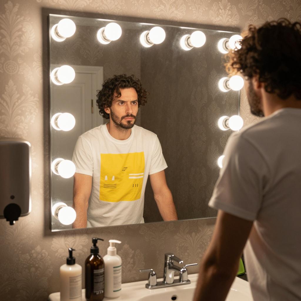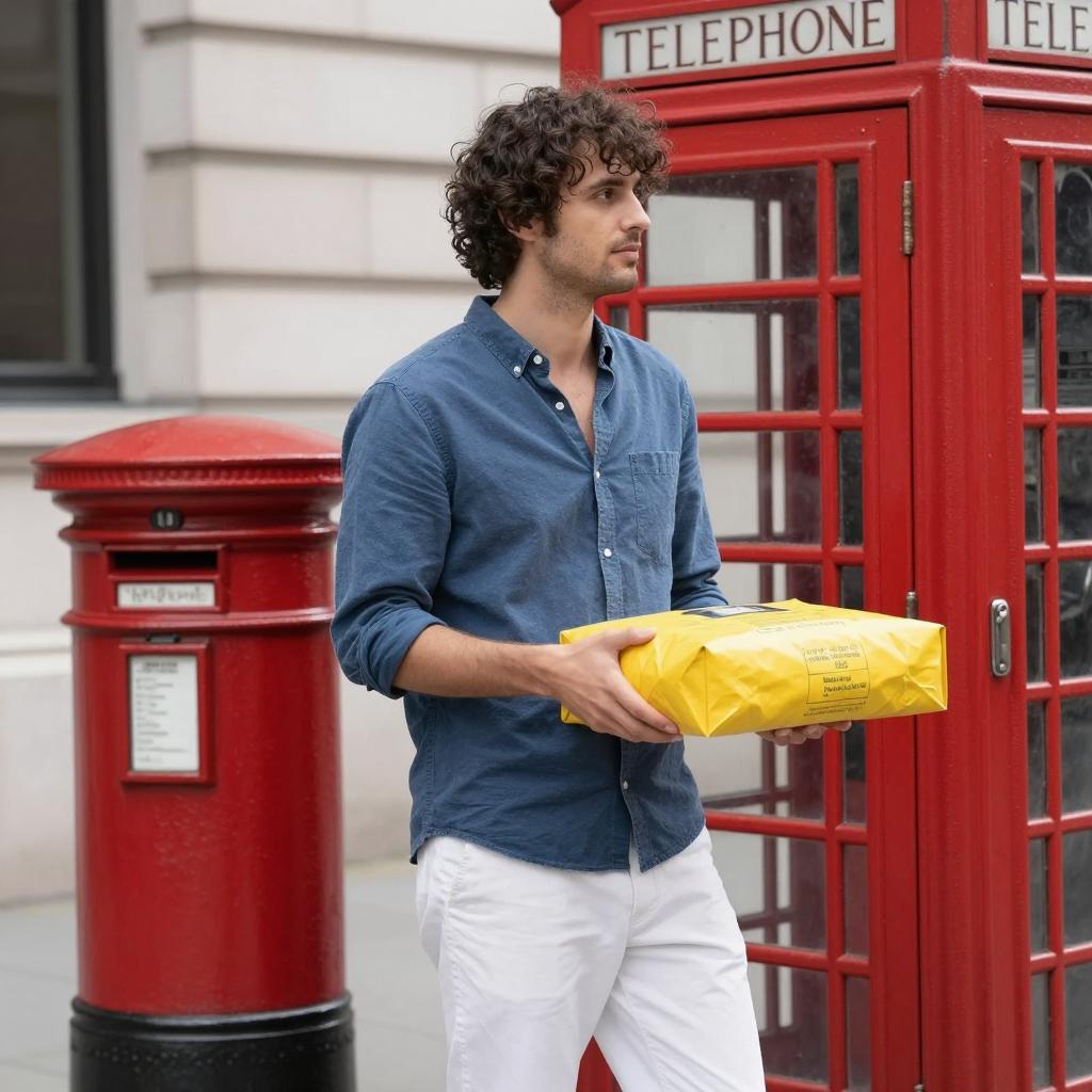Man with curly dark hair, wearing a blue shirt and white pants, standing beside a red London bus, holding a yellow package. Red phone booth and red mailbox in the background. Urban street setting, daylight, casual stance.
