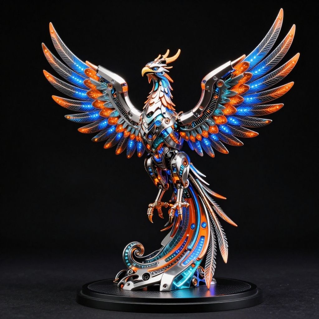 Hyper-detailed futuristic cybernetic phoenix statue crafted from titanium, carbon fiber, vibrant LED lights, and tempered glass. The statue features intricate linework and vibrant colors with a high contrast matte finish, inspired by Syd Mead and Hajime Sorayama. The phoenix has a mechanical design with glowing orange and blue LED lights, sharp metallic feathers, and stands on a round display base against a black background.
