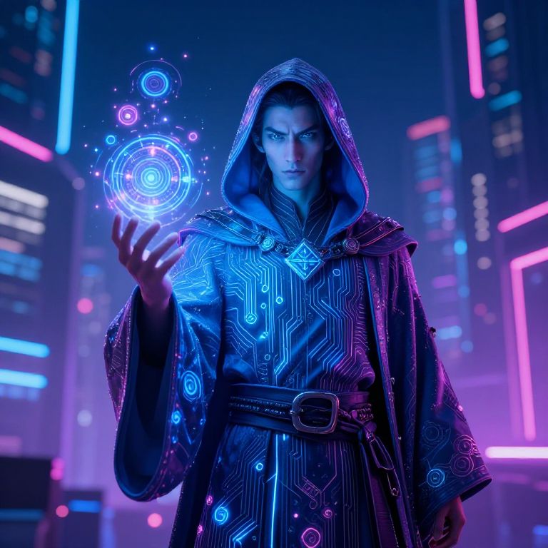 Mago ai, a futuristic sorcerer merging magic and artificial intelligence, glowing digital runes floating around, wearing a cloak made of circuit patterns, standing in a neon-lit cyber cityscape, blending fantasy and sci-fi aesthetics, highly detailed, vibrant colors