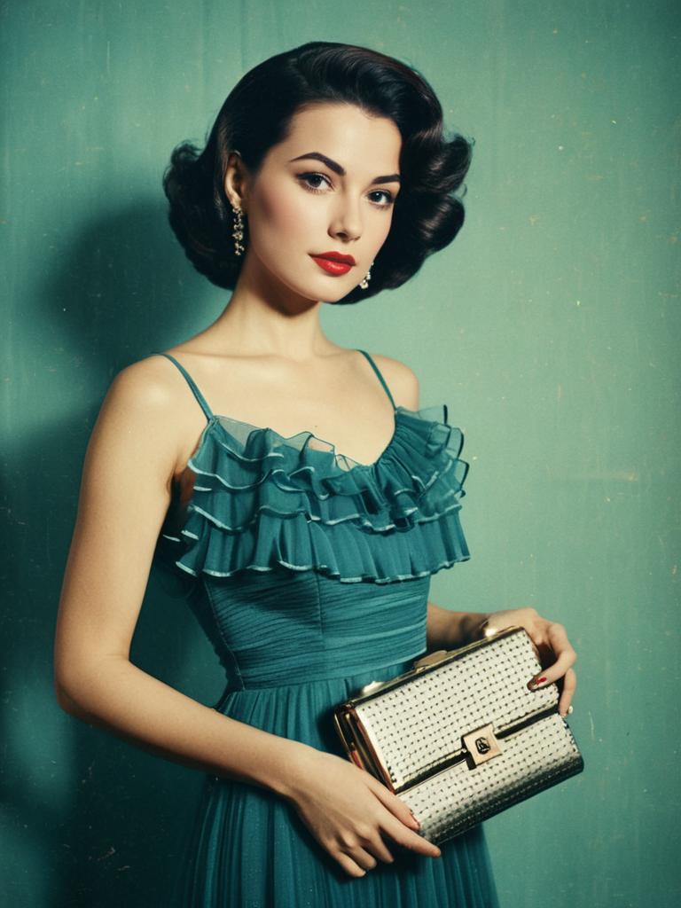 Portrait of a stylish young woman with dark retro curls, wearing a sleeveless teal evening dress with spaghetti straps and a ruffled overlay bodice. She is holding a metallic silver clutch purse against a muted teal background, showcasing a vintage-inspired look with bold red lipstick and delicate drop earrings.