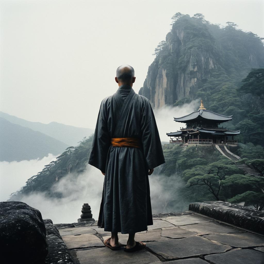 A somber monk stands in reflective melancholy at the entrance of an ancient Japanese temple shrouded in mist. The monk wears a simple, dark robe with an orange sash, looking downward in a moment of introspection. The traditional multi-tiered temple building with tiled roofs and wooden pillars creates a serene, historical atmosphere.