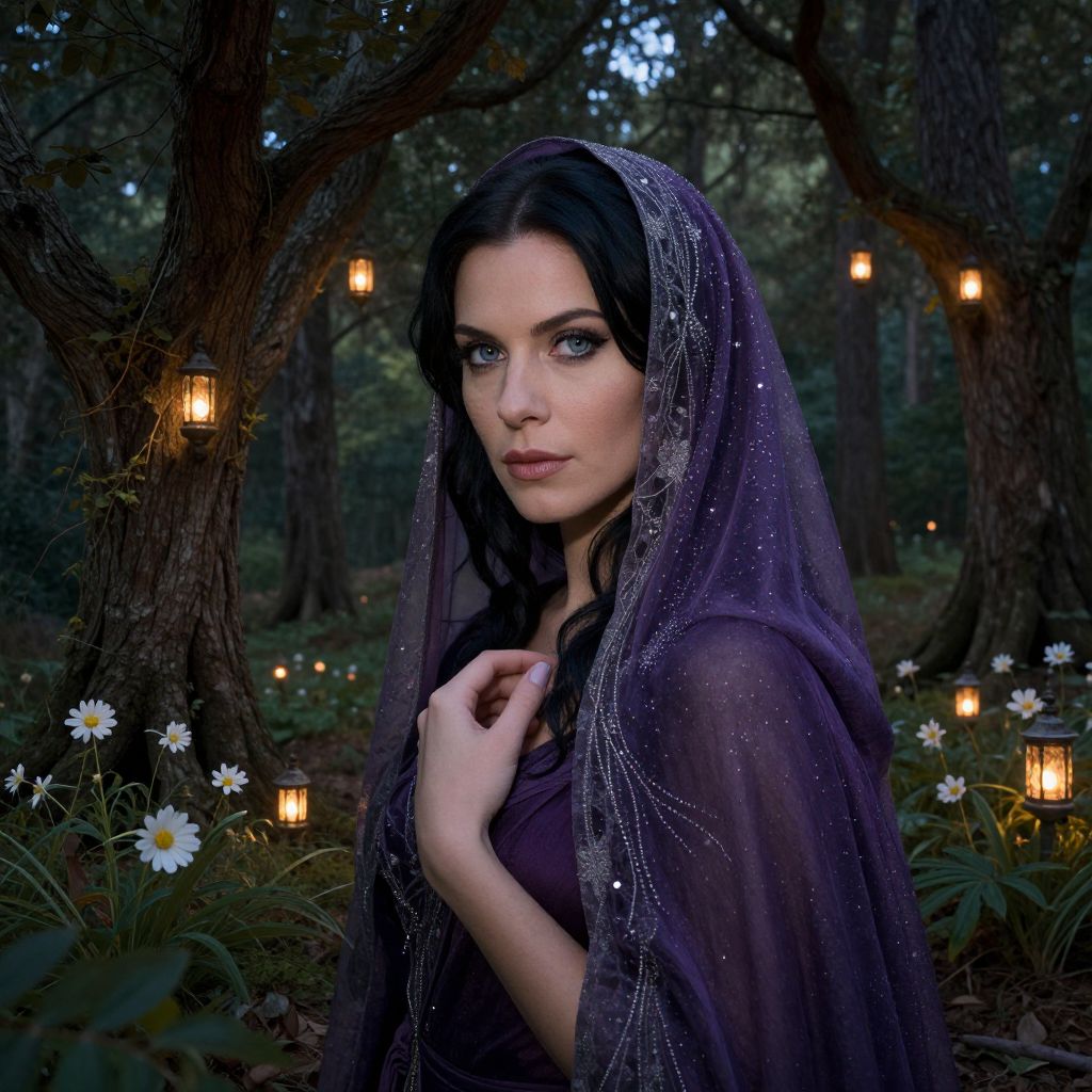Photograph of a young woman with fair skin and striking blue eyes, standing in a dark forest at night. She has long, wavy black hair and wears a sheer, purple veil adorned with sparkling silver threads, covering her head and shoulders. Her expression is calm and introspective. She is dressed in a matching purple garment. Around her, small, warm yellow lanterns are hung from tree branches, casting a soft glow. White daisies are scattered among the dark green foliage at her feet. The background is densely wooded, with tall trees and dimly lit by the lanterns.