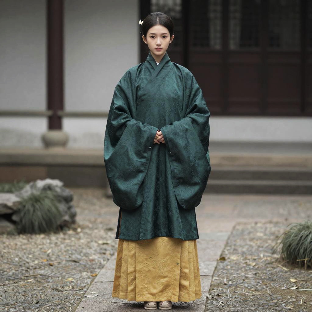 Masterpiece, best quality, realistic, realskin, 1girl, solo, outdoor, (hanfu, ming style outfits, white short coat, standing collar, blue mamian skirt)