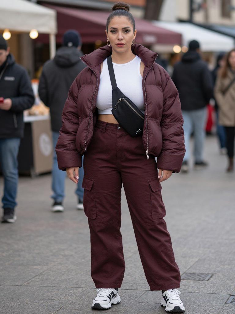 A Pear-shaped body type woman in casual streetwear, featuring an oversized burgundy puffer jacket, white cropped tank top, and high-waist burgundy cargo pants, stands at a bustling cultural street fair, embodying the visual style of Juan Francisco Casas Ruiz. She carries a black fanny pack across her chest and wears white and black sneakers. Sexy. Pretty face and beаutiful eyes. Big breasts