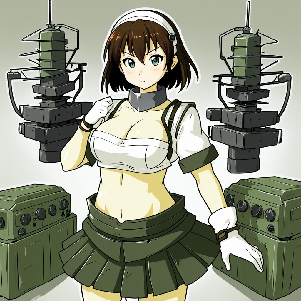 This digital anime-style drawing features a young woman with short brown hair and large blue eyes, wearing a white sailor-style crop top that reveals her midriff and a dark green pleated skirt. She also has white gloves and a white headband with a small device on top. She stands confidently with one hand on her hip and the other raised, holding two large, intricate mechanical devices on either side. These devices are reminiscent of naval artillery and have a green, metallic appearance with various gears and cables. The background is a simple gradient from light gray at the top to white at the bottom. The overall style is bold with thick black outlines and flat, vibrant colors.