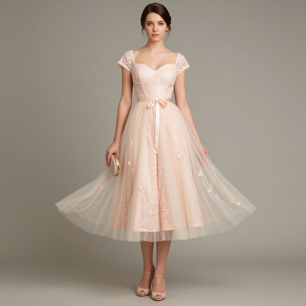 Photograph of a young woman with fair skin and dark hair in an elegant updo, wearing a knee-length, pale pink, lace and tulle cocktail dress with short, cap sleeves and a modest V-neckline. The dress has a fitted bodice and a full, flowing skirt. She holds a small, gold clutch in her right hand and wears nude, open-toed high heels. The background is a plain, light gray studio setting. Her expression is neutral, and she stands facing forward with her arms relaxed at her sides. The overall style is classic and sophisticated.
