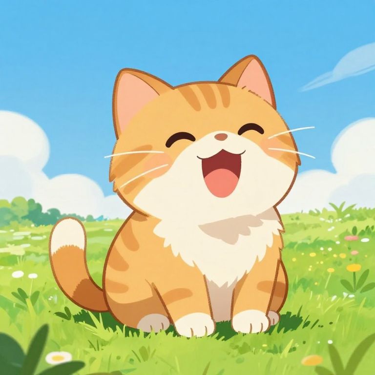 Digital drawing of a cute, chubby orange tabby kitten with white chest and paws, sitting in a bright green grassy field. The kitten has large, expressive eyes closed in joy, an open mouth showing a pink tongue, and a fluffy tail curled to the side. The background features a clear blue sky with a few white clouds and scattered yellow and white flowers. The style is cartoonish with bold, clean lines and vibrant colors, evoking a cheerful and playful mood. The kitten's fur has visible orange stripes, adding texture to its appearance.