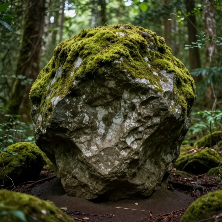 Photograph of a large, moss-covered rock in a lush, green forest, surrounded by smaller mossy rocks, with sunlight filtering through dense trees in