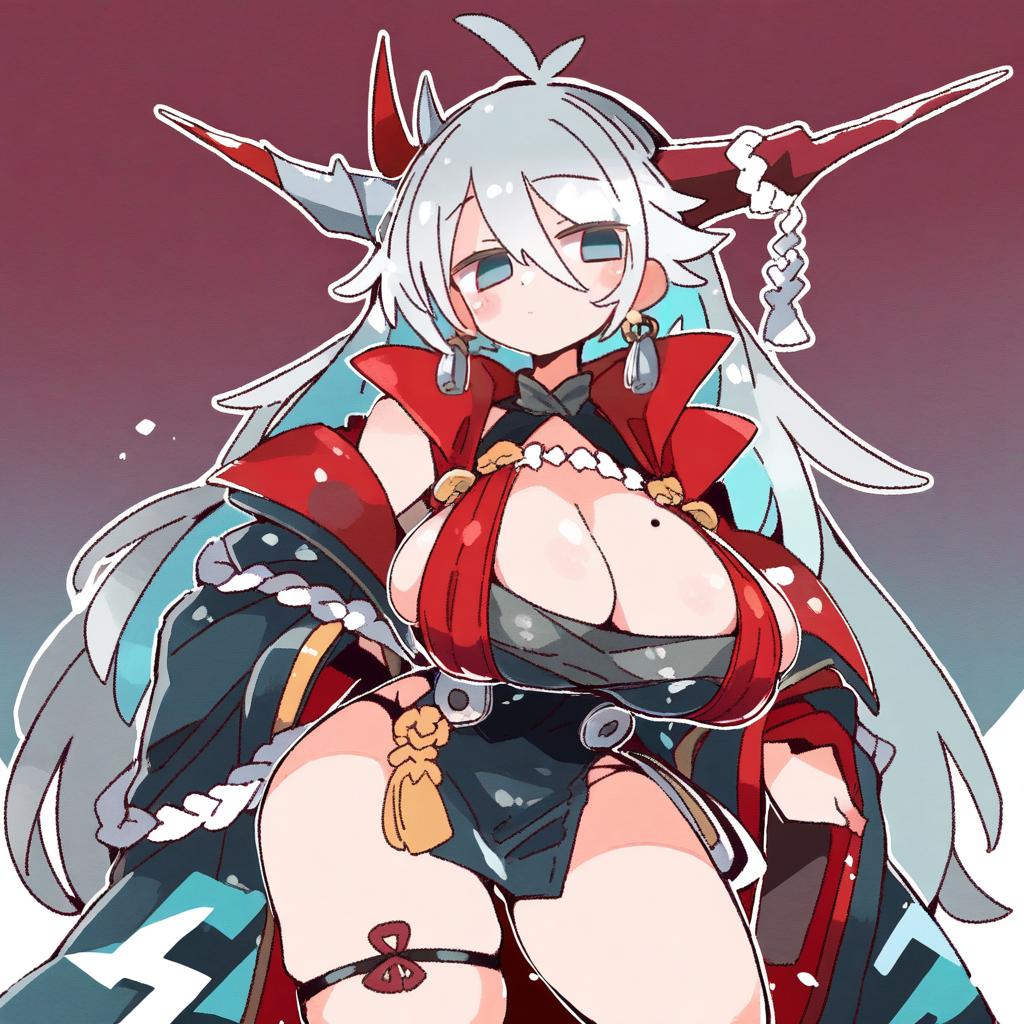 Hakuryuu (azur lane), azur lane, 1girl, asymmetrical horns, mismatched horns, red horns, white horns, hair on horn, multiple horns, hair between eyes, grey eyes, white hair, long hair, grey hair, very long hair, large breasts, huge breasts, mole on breast, cleavage, thigh strap, skindentation, earrings, by artist massakasama, animagine