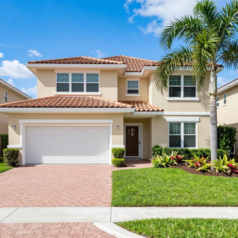 Photograph of a two-story suburban house with a beige stucco exterior and red-tiled roof. The house features a white garage door on the left, a dark brown front door in the center, and two sets of white-framed windows on the upper level. A tall palm tree stands to the right of the house, with a well-maintained green lawn and small shrubs in front. The driveway is paved with red bricks, and the sky above is bright blue with a few white clouds. The house is flanked by neighboring homes.